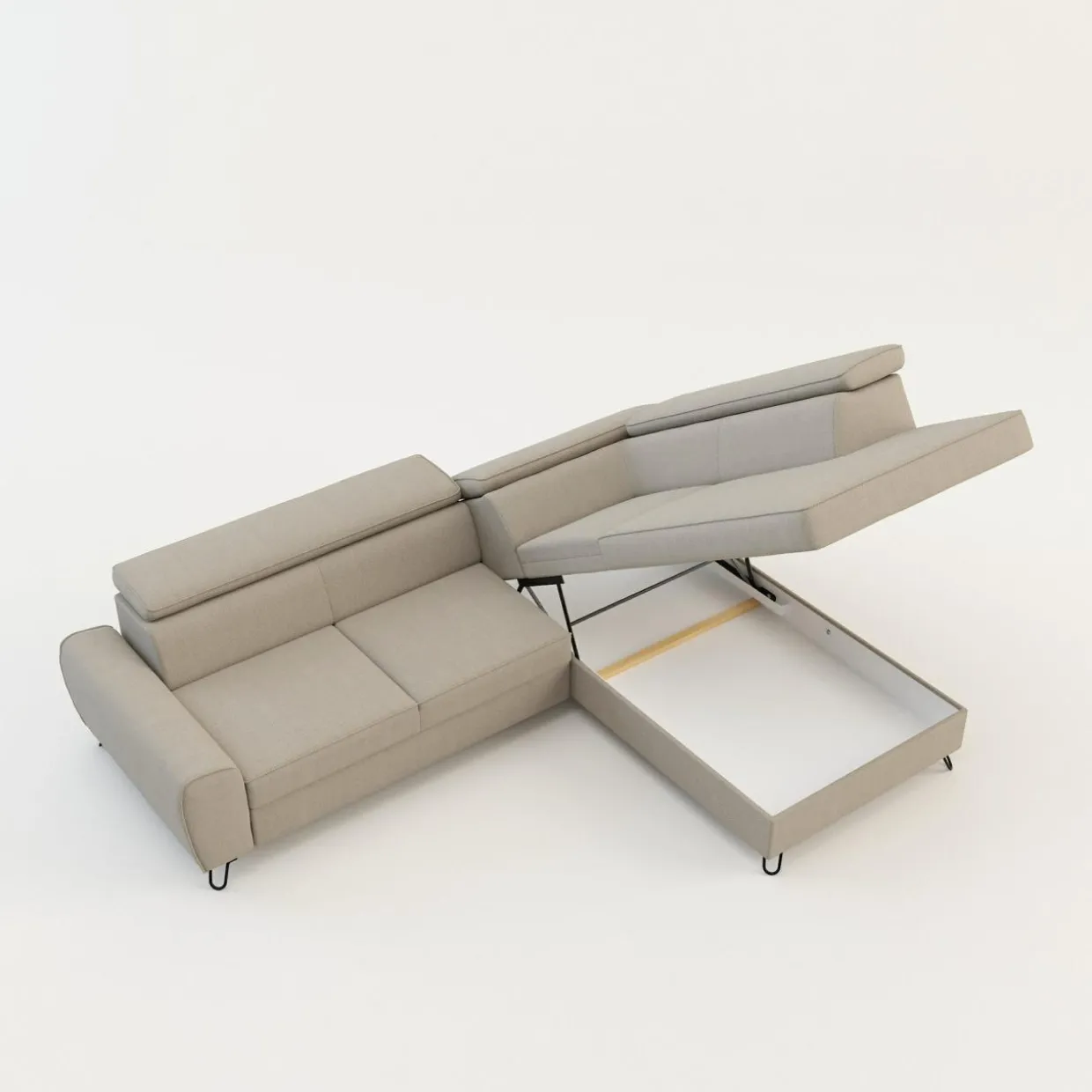 - Narożnik posiada 3 regulowane zagłówki na całej długości narożnika, dzięki czemu każdy z gości może usiąść równie komfortowo.