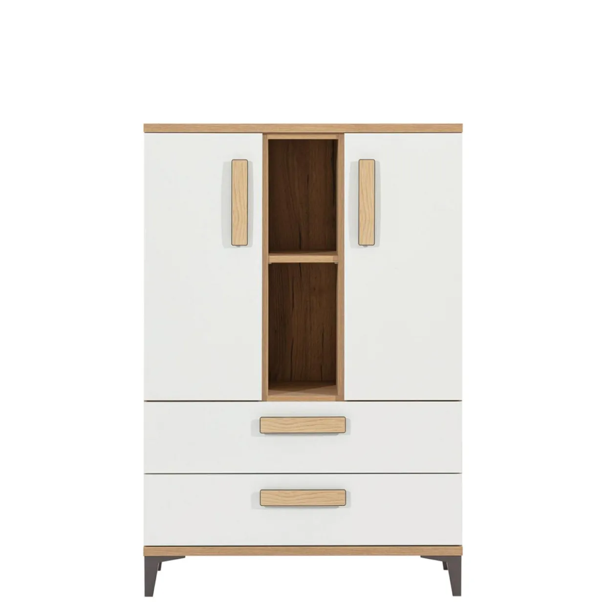 - Połyskujące wykończenie, wysokie ukośne nóżki i uchwyty w kolorze imitującym jasne drewno idealnie pasują do mieszkania urządzonego w nowoczesnym stylu.
