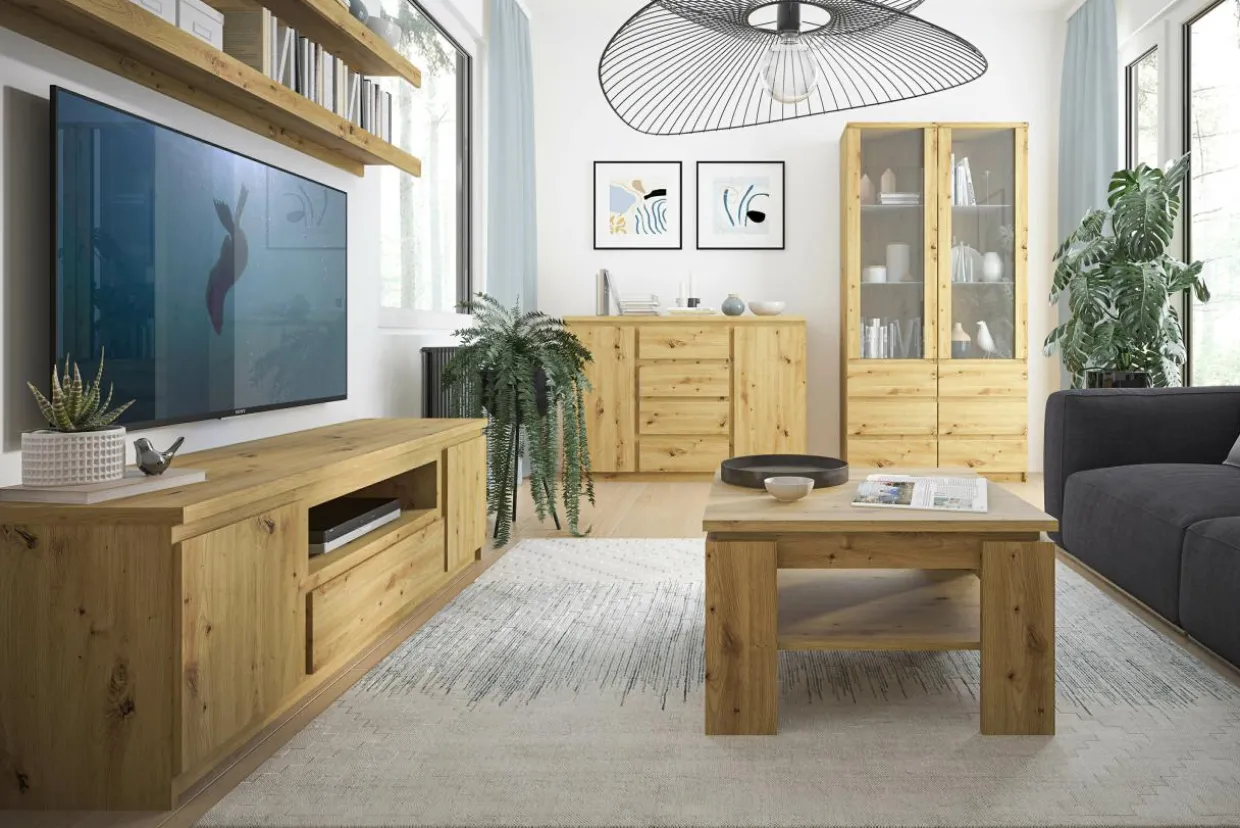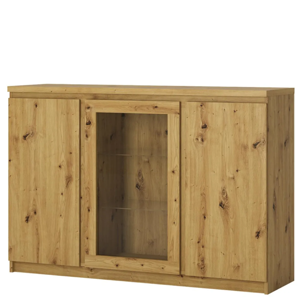 - Wykończenie przeszklonej komody łączy w sobie nutę nowoczesności oraz ponadczasowy urok odcienia dębu artisan.