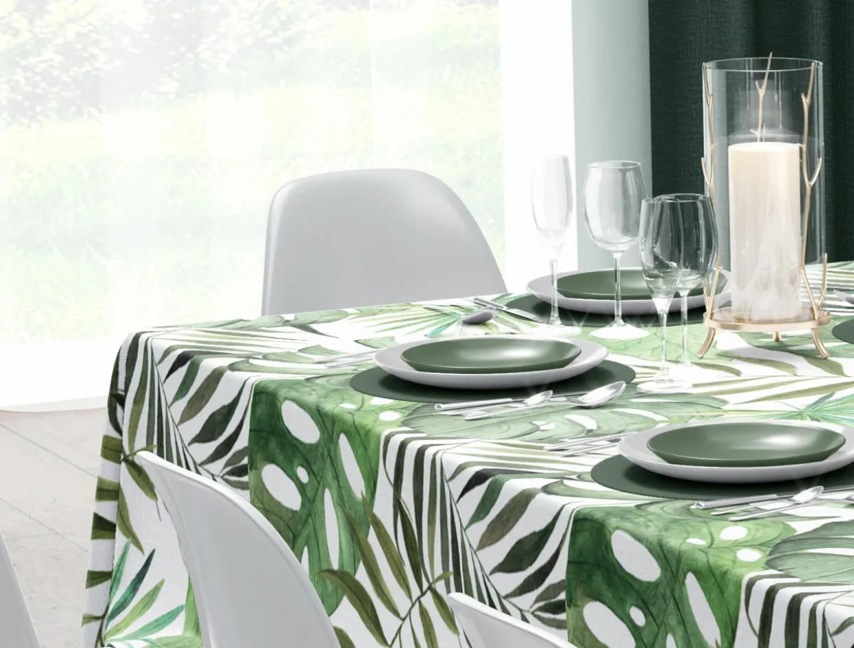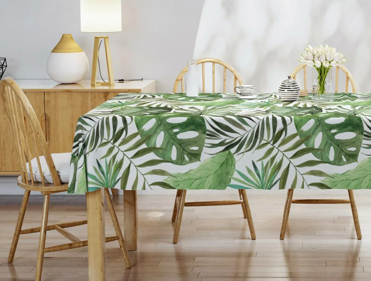 Lubisz roślinne wzory? Obrus w liście monstery wizualnie ożywi wnętrze Twojej jadalni lub kuchni. Twoja porcelanowa zastawa będzie na nim pięknie wyglądać.