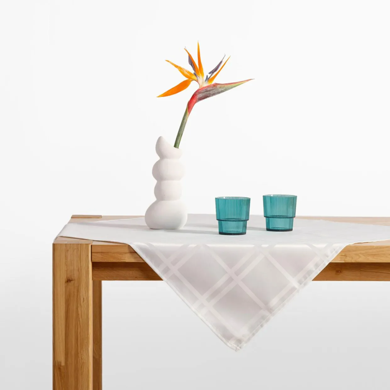 ObrusCascade to klasyczny i elegancki dodatek do wnętrza, który dzięki subtelnemu żakardowemu wzorowi kraty wprowadza delikatny efekt dekoracyjny. Jego kompaktowy rozmiar 85×85 cm sprawia, że idealnie nadaje się na małe stoły lub stoliki kawowe.