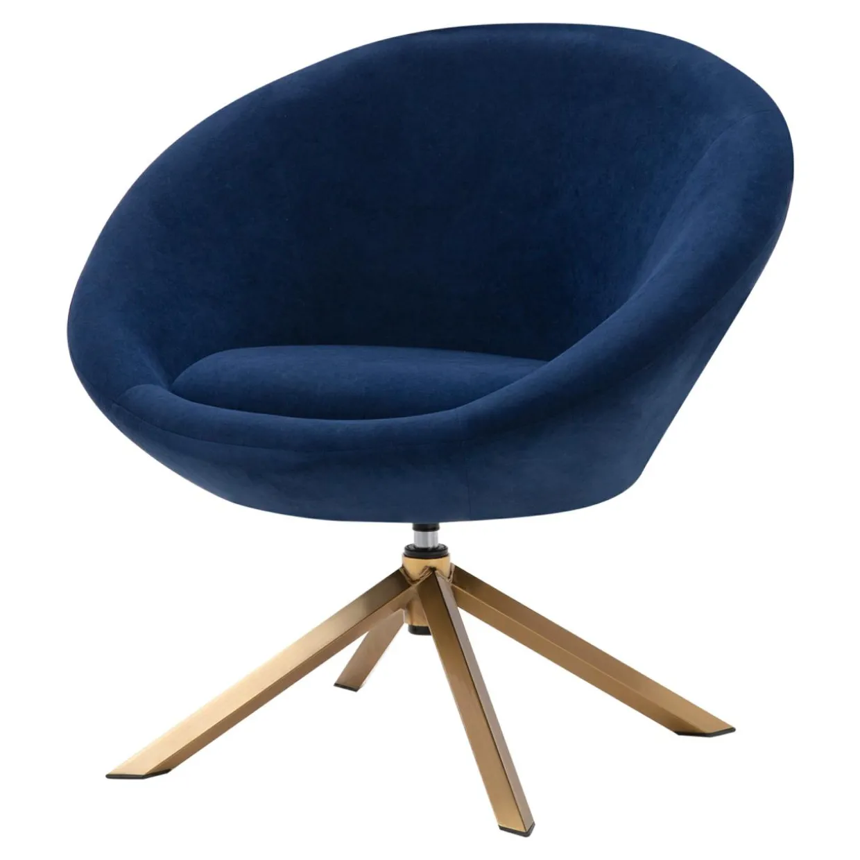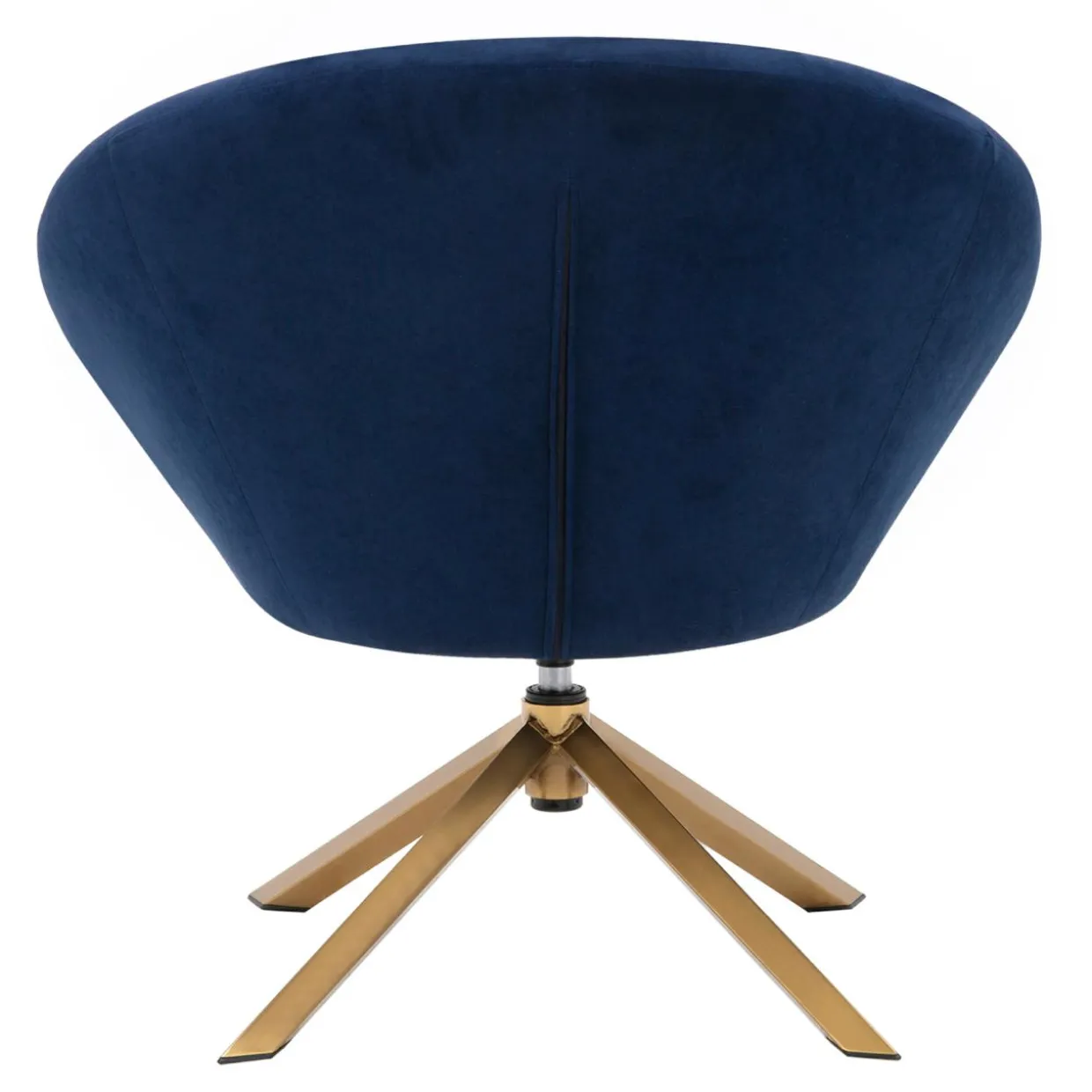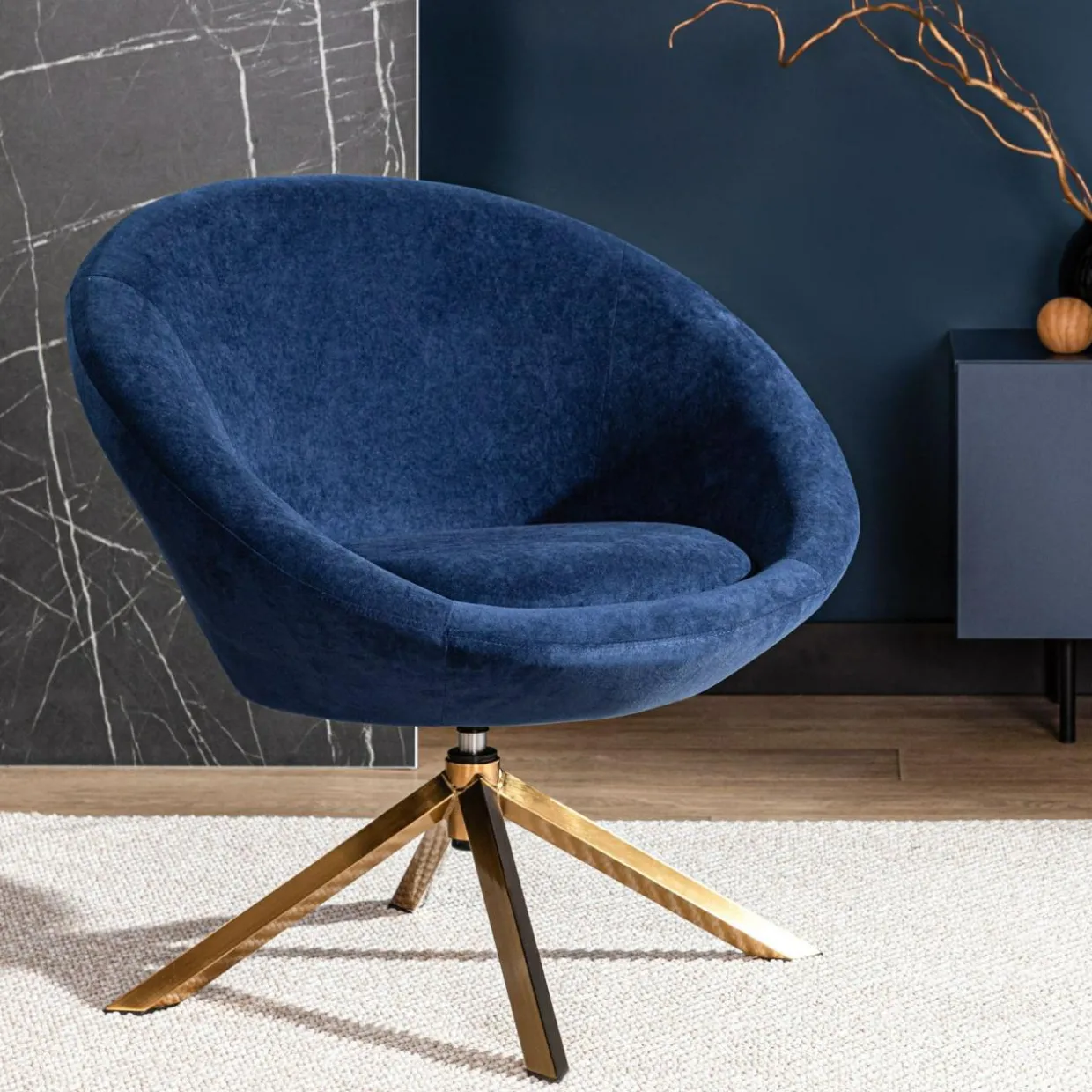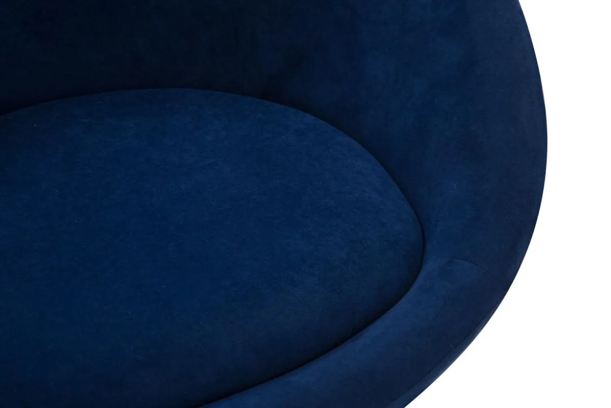 - Fotel pokryto welurem w granatowym kolorze. Wygląda wytwornie w połączeniu ze złotą podstawą.