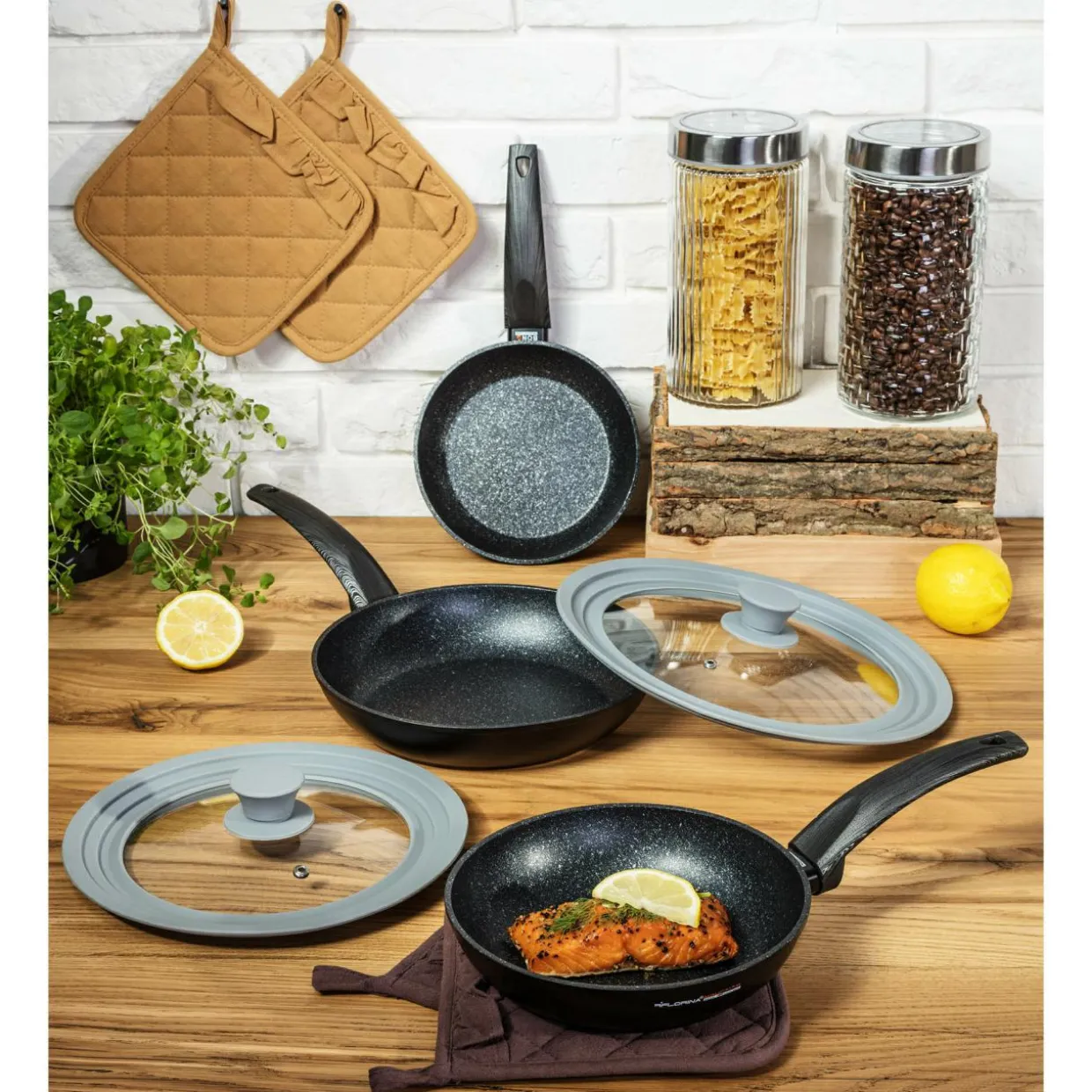 Aluminiowa patelnia BONO BY MATEUSZ GESSLER marki FLORINA jest pokryta nieprzywieralną powłoką typu marmur, nakrapianą srebrnymi drobinkami. Dzięki niej nie musisz obawiać się o przypalenia a następnie bez problemu ją umyjesz.