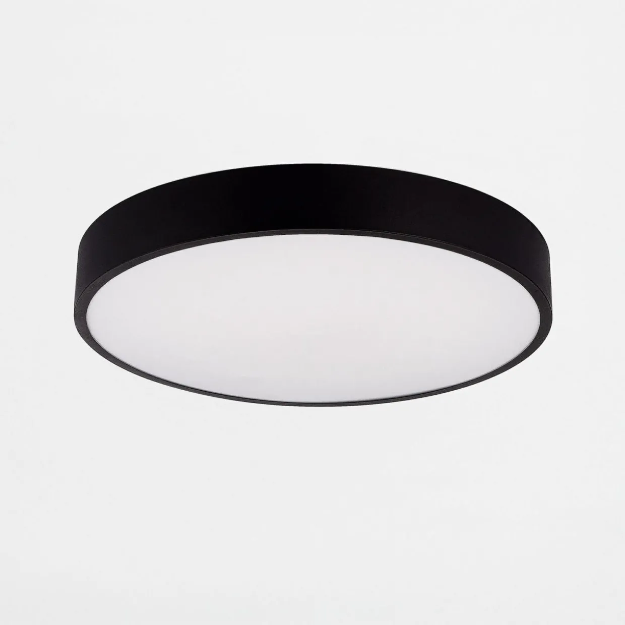 - Wyróżniająca się, czarna obudowa lampy z wkomponowanym modułem LED spełnia rolę na równi oświetlenia, jak i ozdoby sufitu. Wypełnienie plafonu jest mlecznobiałe.