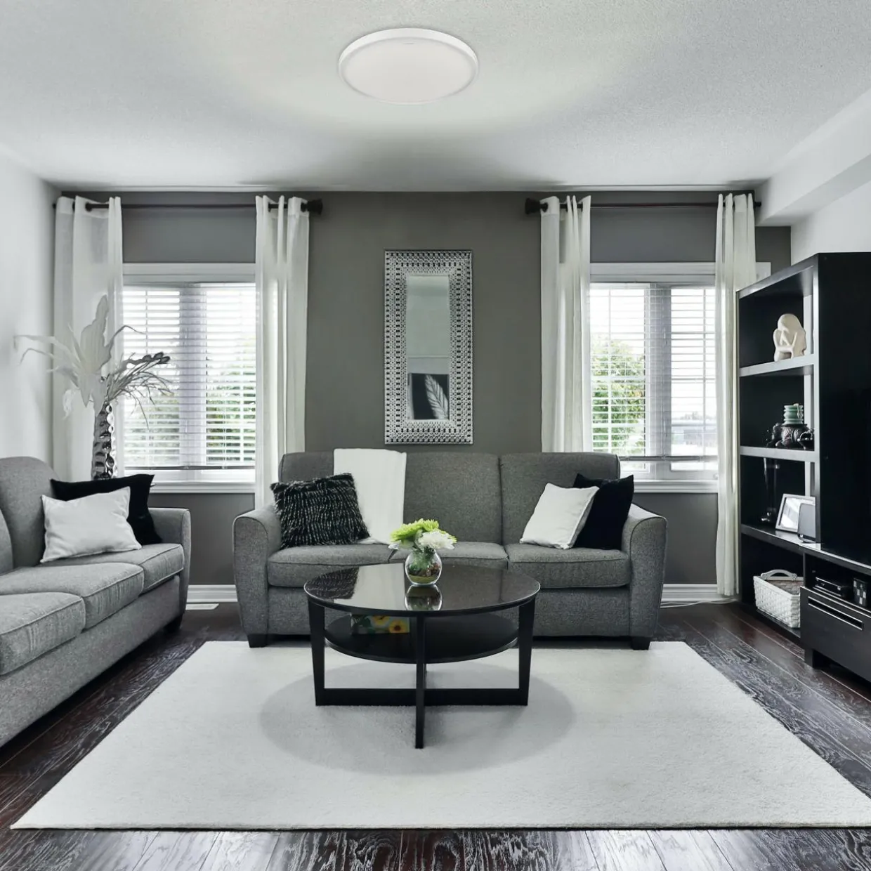 Podstawa plafonu FABIO ma kształt okręgu, które wypełnione zostało wysokogatunkowym tworzywem. Wnętrze skrywa wbudowane oświetlenie SMD LED. Emituje ono jasne, białe światło o barwie 4100K i strumieniu świetlnym oprawy rzędu 3360 lumenów (strumień świetlny źródła światła wynosi 5390 lumenów).