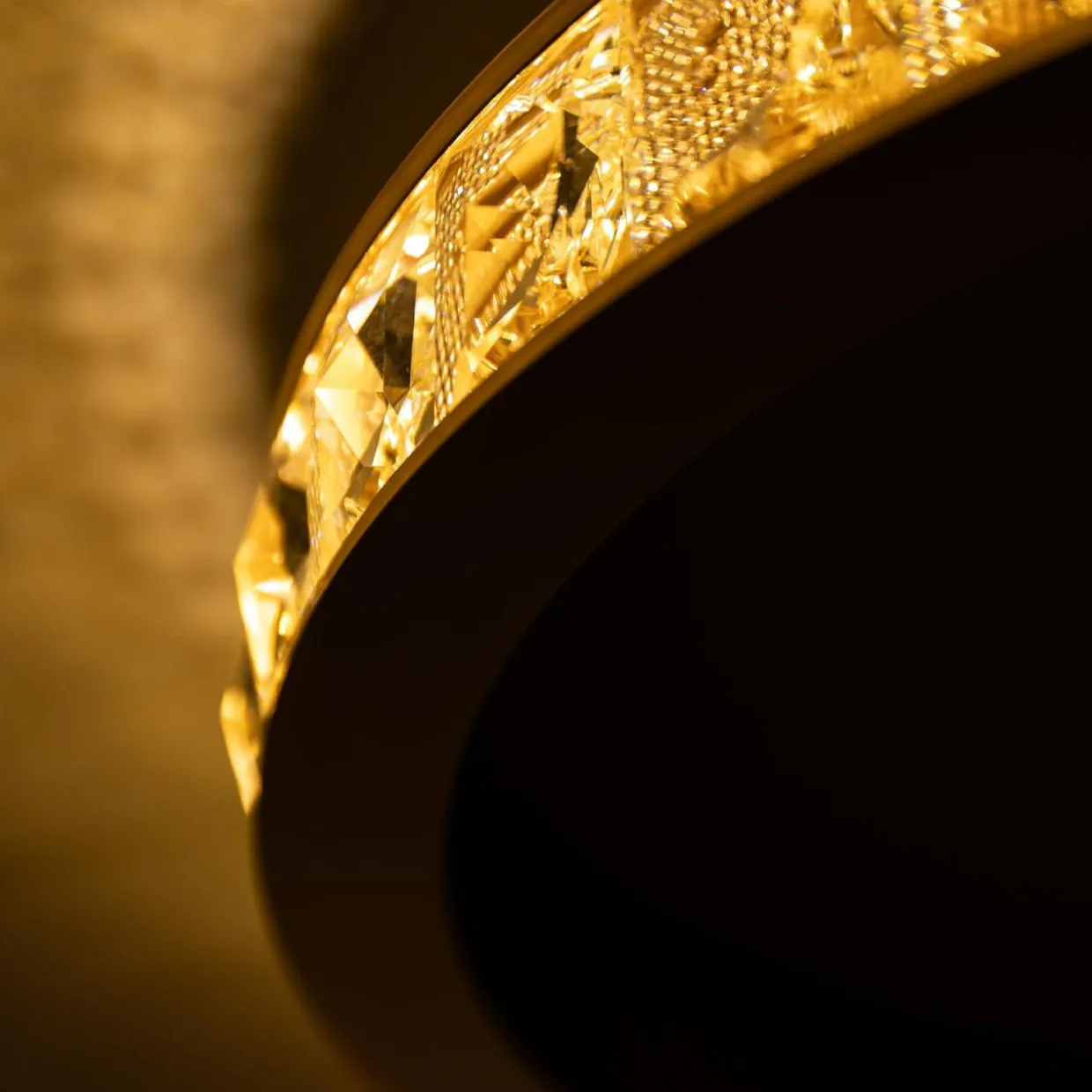 - Wykończenie w złotym kolorze uzupełnione akrylowymi kryształkami sprawia, że po zapaleniu świetlne refleksy pięknie prezentują się na ścianach i suficie.