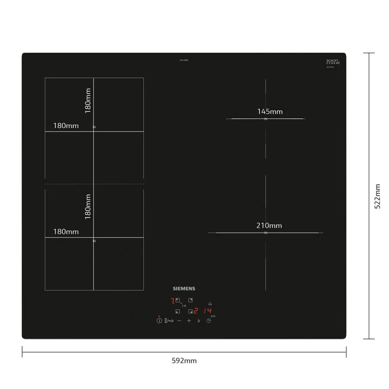 • Wielkość i moc strefy grzewczej: strona prawa, przednia: 210 mm, 2.2 kW (maks. moc 3 kW)