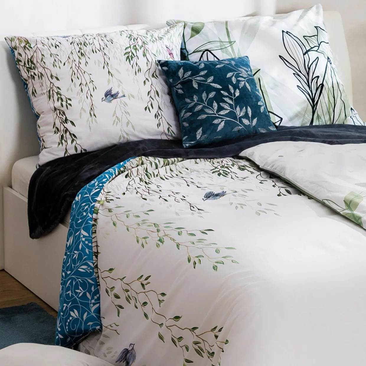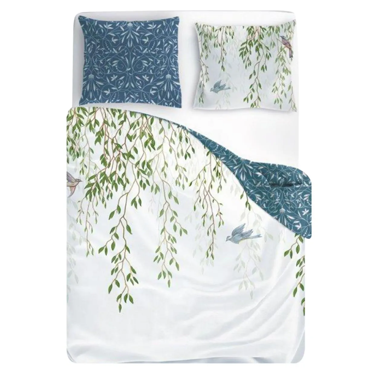 - Pościel jest dwustronna. Przód ma biały kolor, który jest ozdobiony wzorem pnących liści, natomiast rewers nadruk ornamentów na niebieskim tle.
