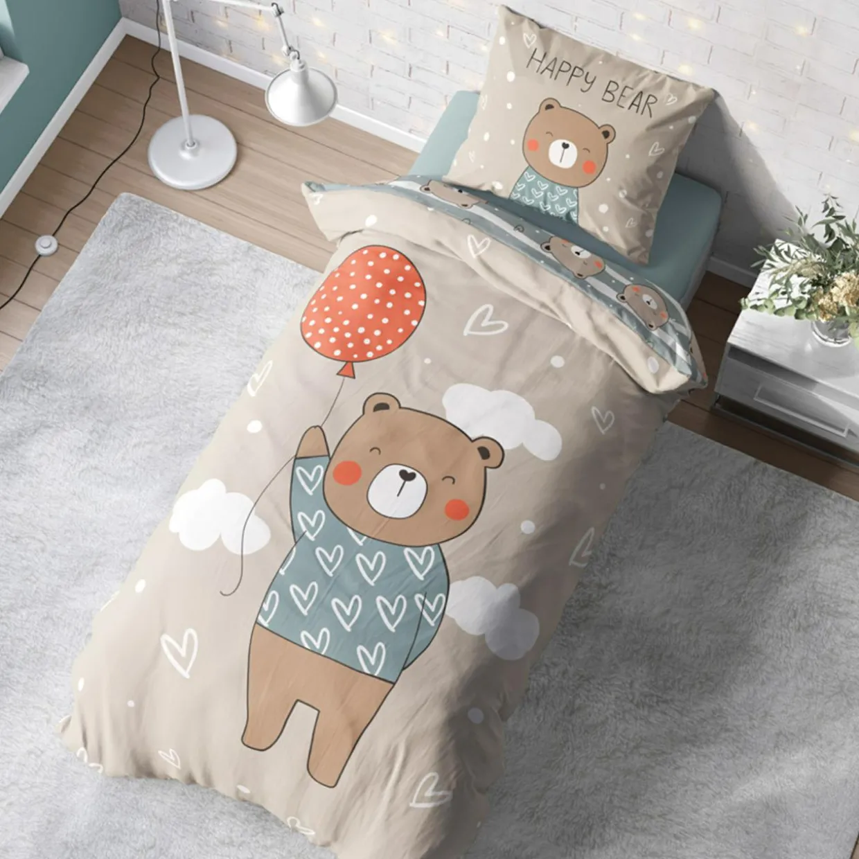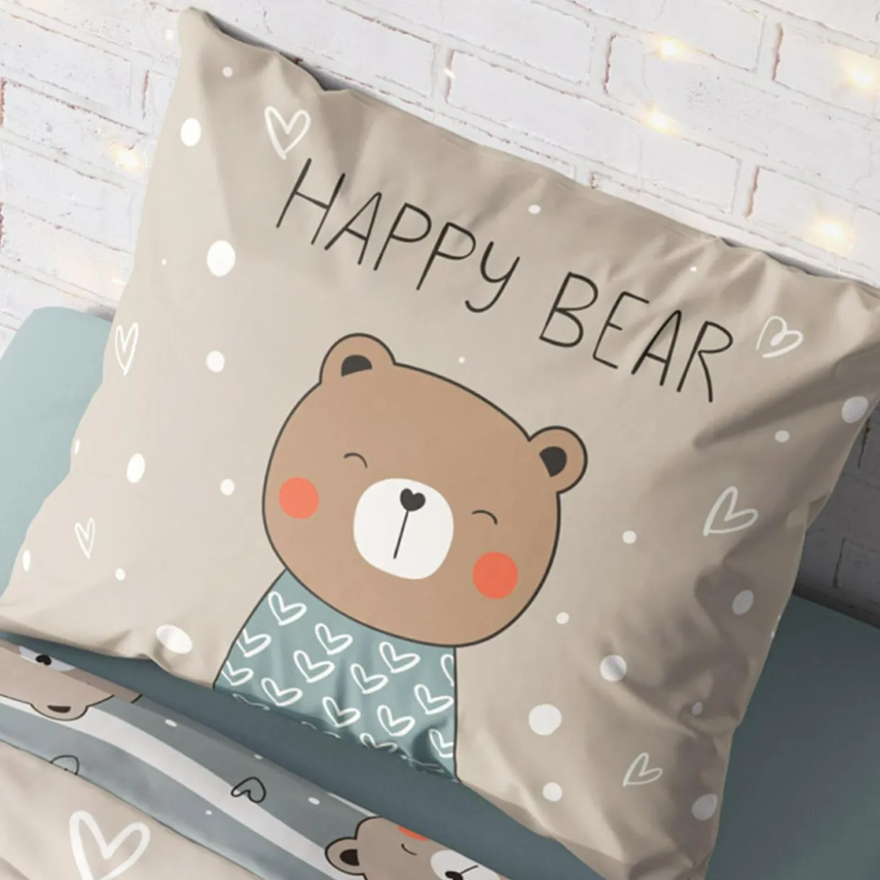 - Pościel wykonana jest z miękkiej w dotyku bawełny, bezpiecznej dla skóry dziecka. Materiał przyjemnie otuli Twojego malucha przed snem. O kolorowe sny zadba wesoły miś (happy bear) w uroczym sweterku w serduszka.