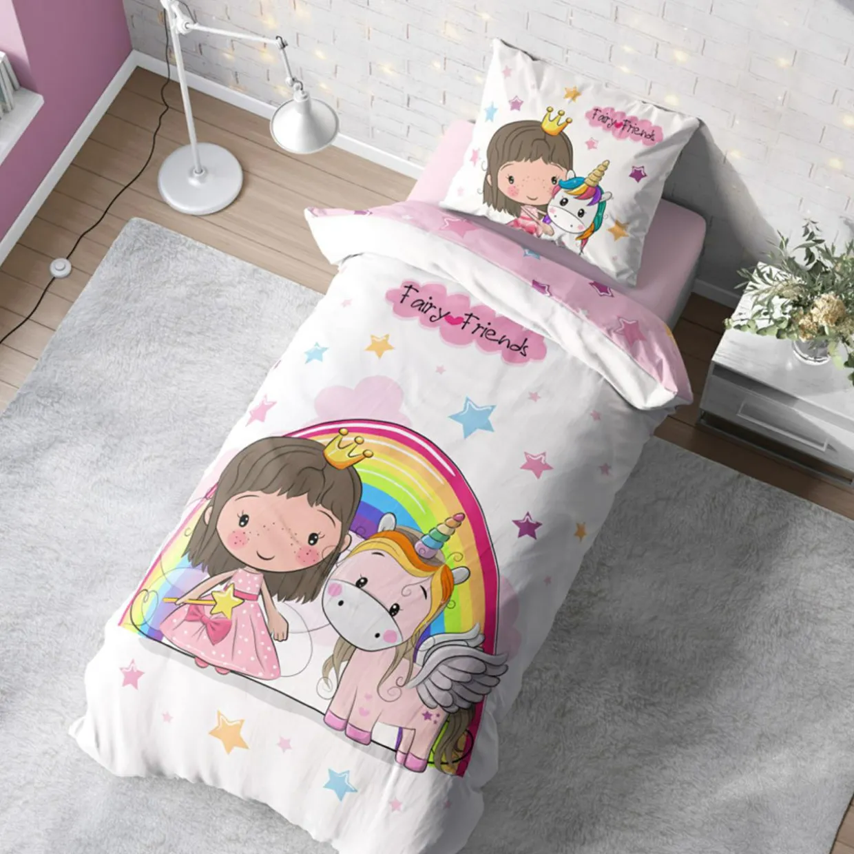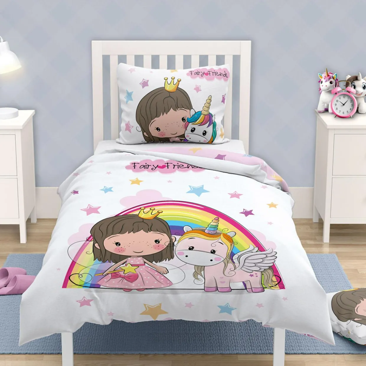 Chcesz, aby Twoje dziecko miało kolorowe sny? Nic tak nie ukoi zmysłów przed zaśnięciem, jak wesoła pościel z wizerunkiem wróżki i towarzyszącego jej jednorożca. Wprowadzi do pokoju Twojej latorośli radosną energię.