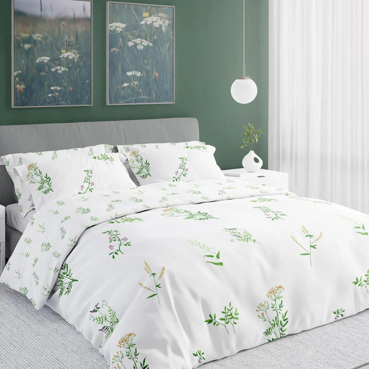 Pościel bawełniana z motywem dzikich kwiatów wprowadza do sypialni naturalny urok. Wzór przedstawiający delikatne polne rośliny nadaje wnętrzu subtelny, rustykalny charakter, przywołując atmosferę letniej łąki. Miękka, przewiewna tkanina bawełniana zapewnia komfortowy sen i jest odpowiednia nawet dla wrażliwej skóry.