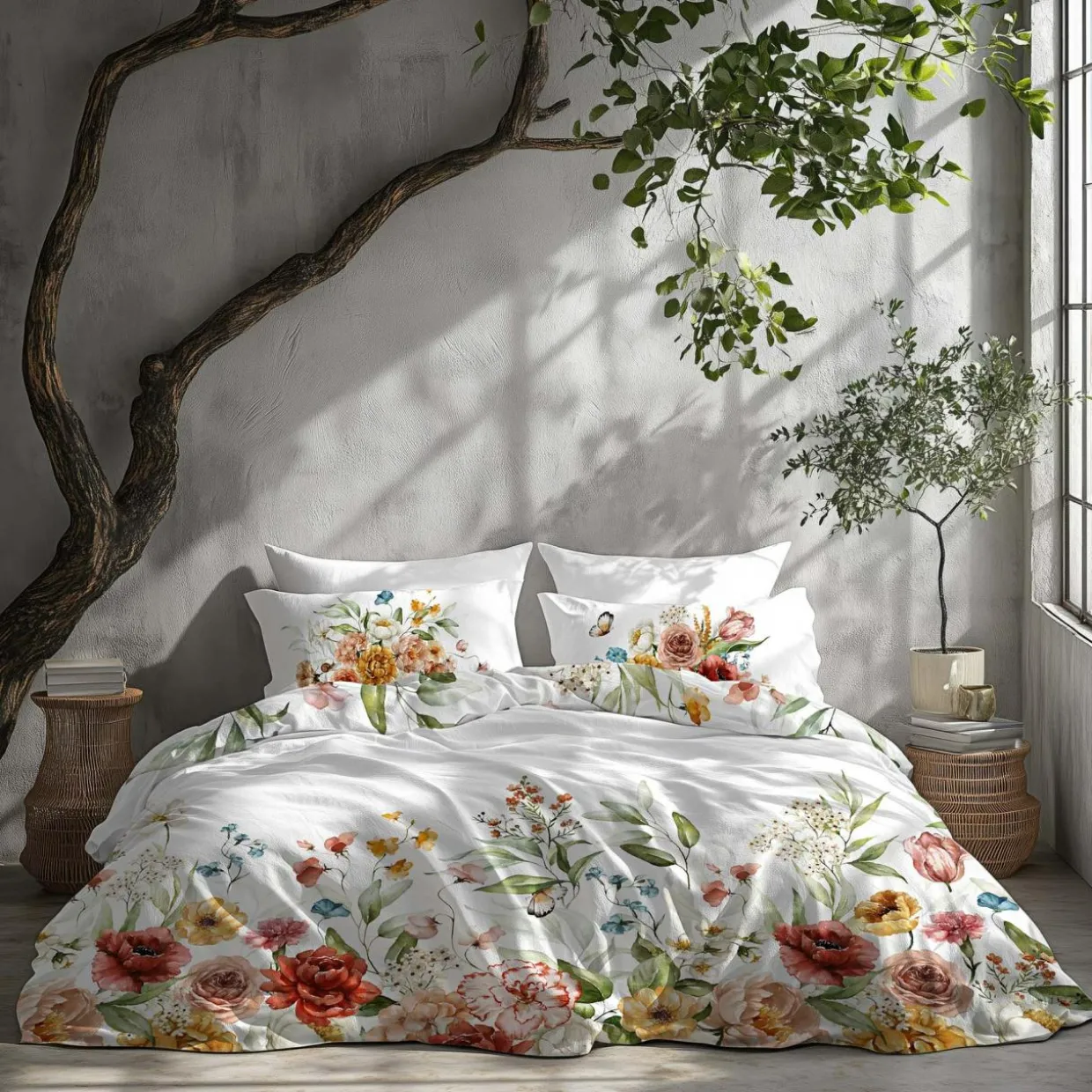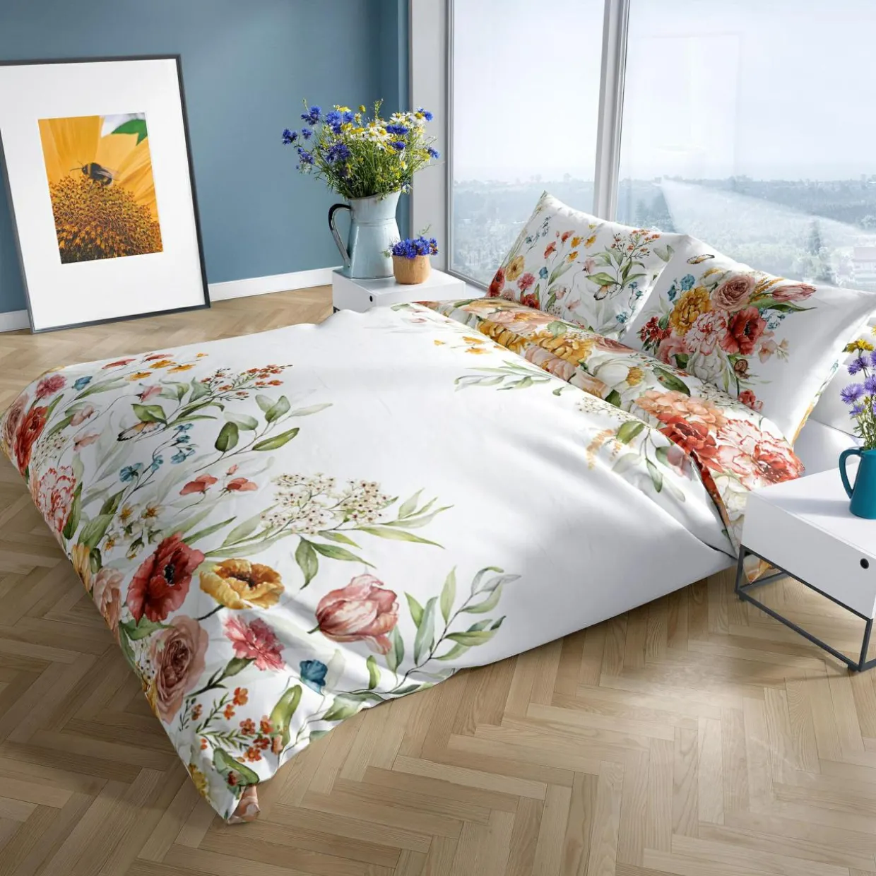 - Barwny motyw polnych kwiatów sprawia, że komplet będzie idealnie pasował do sypialni urządzonej w stylu romantycznym, rustykalnym czy angielskim. Białe, delikatne tło nadaje wzorowi sielskiej elegancji.