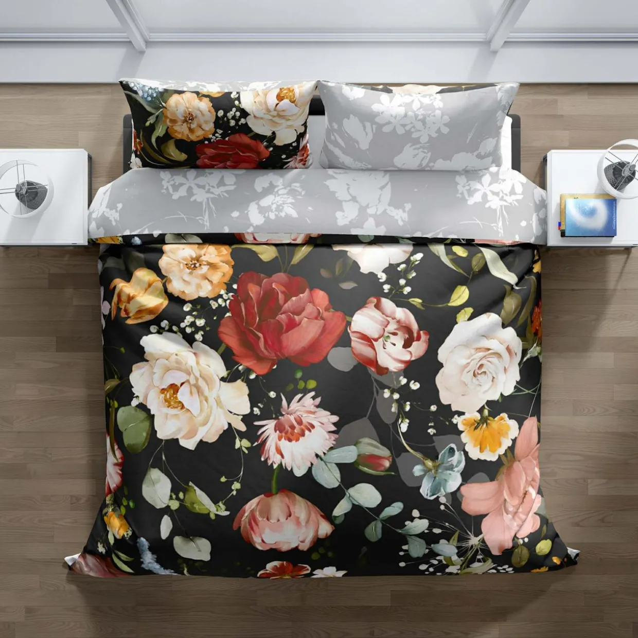 - Ciemne tło podkreśla wyrazistość kwiatowych barw. Ten ciekawy wzór nada Twojej sypialni głębi i elegancji.