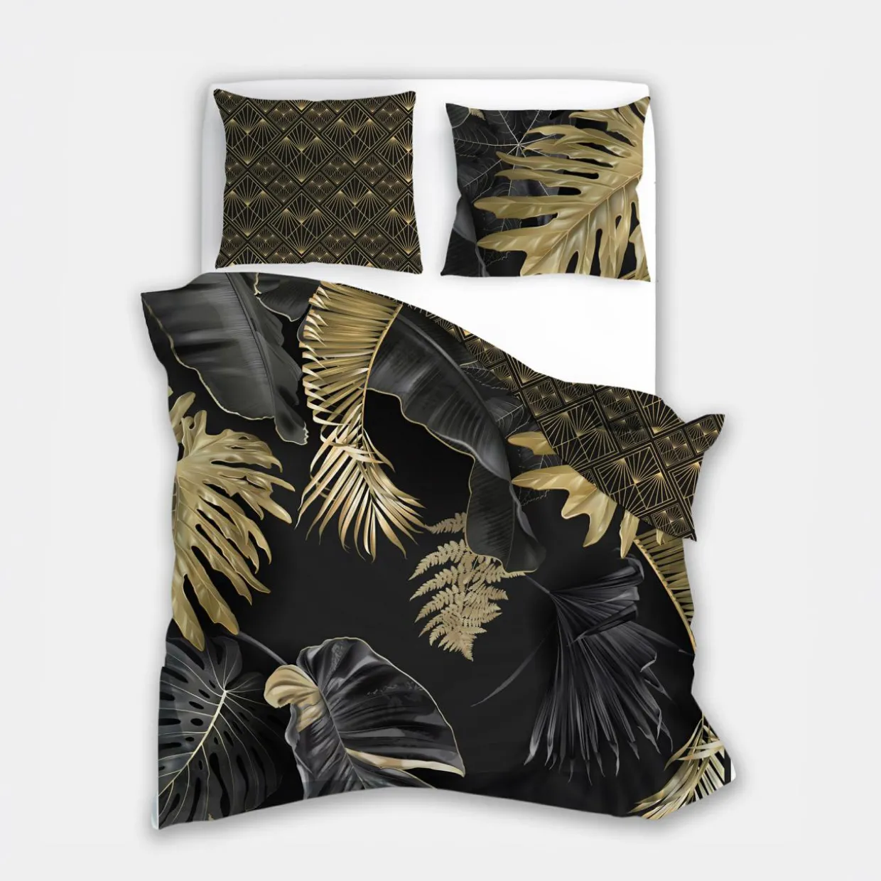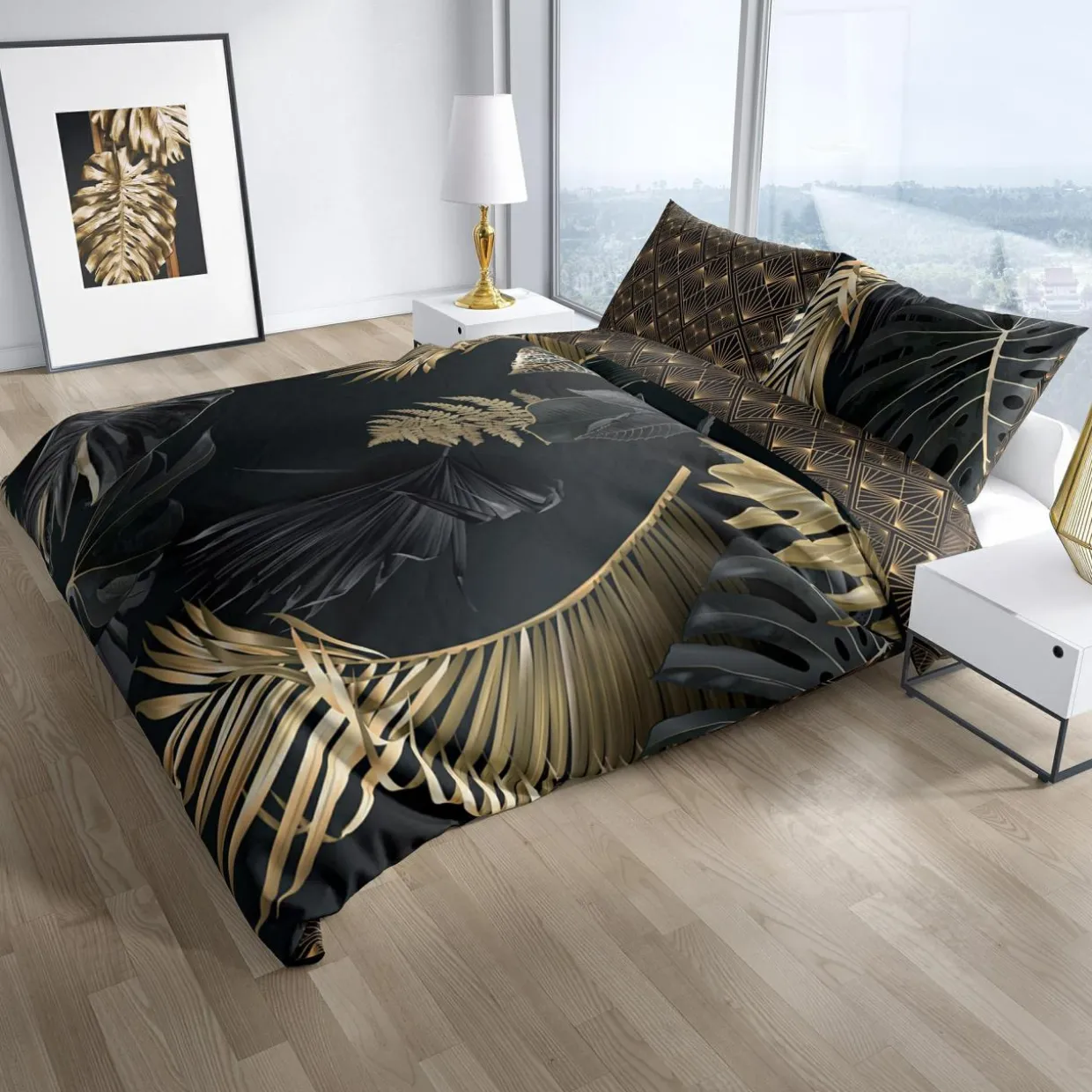 Czarna pościel udekorowana złotawymi akcentami liści palm i paproci będzie świetnie pasować do sypialni łączącej style urban jungle i glamour.