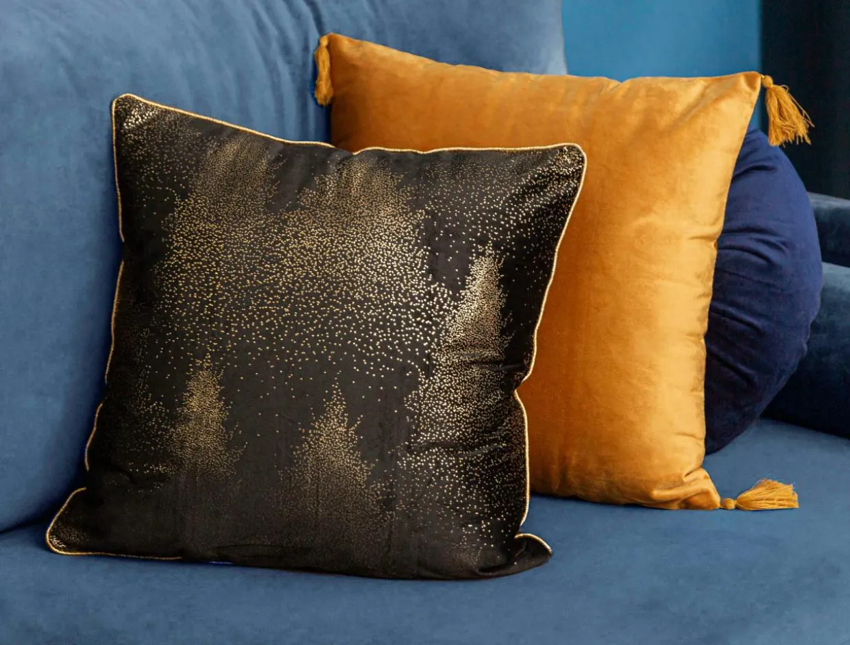Czarna poszewka ozdobiona brokatowym nadrukiem lasu będzie pasować do Twojego salonu na co dzień i od święta.