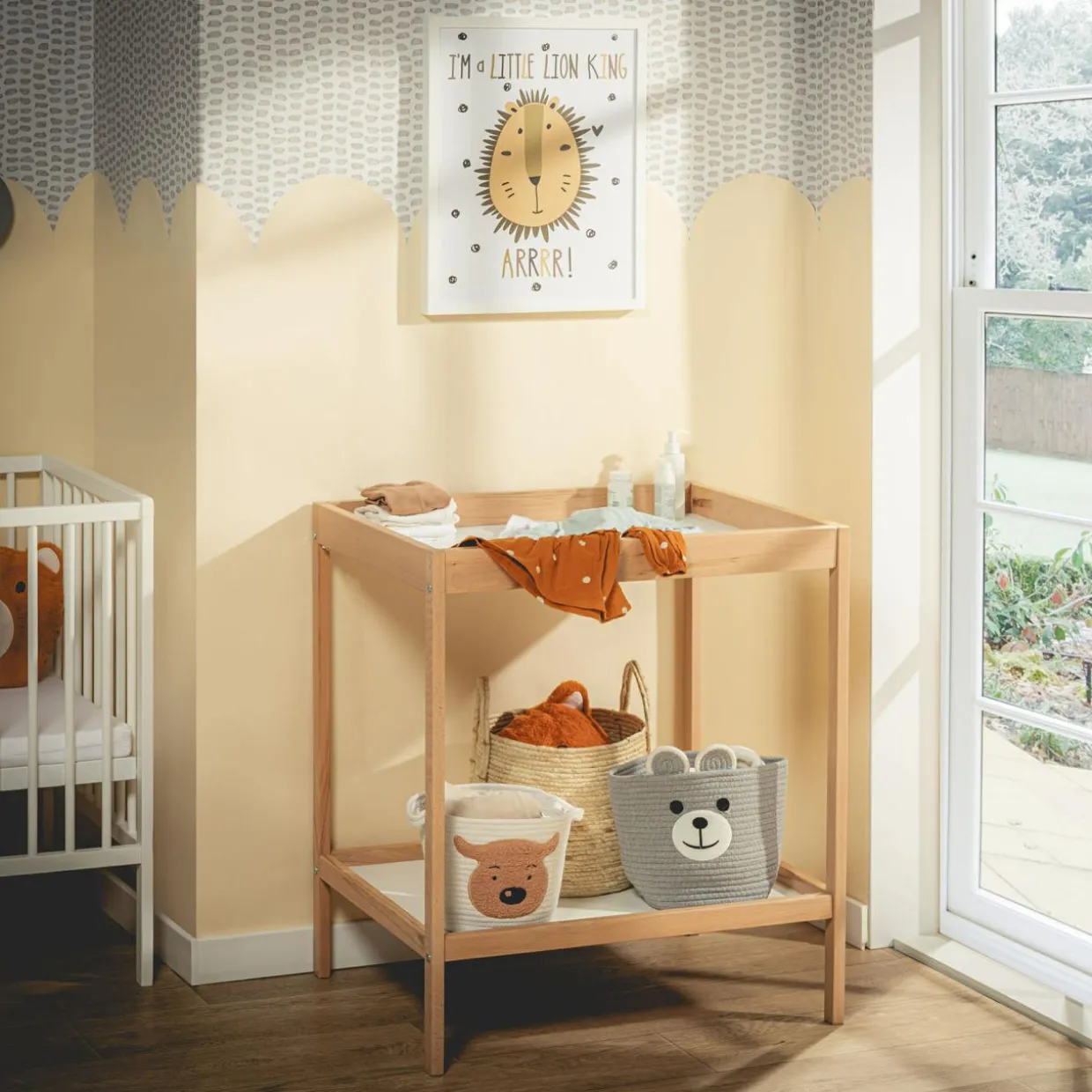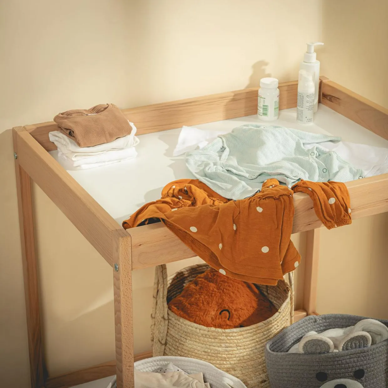 Czyste pieluchy, krem do pielęgnacji czy mokre chusteczki możesz położyć na dolnej półce, by mieć do nich szybki dostęp podczas przewijania malucha.