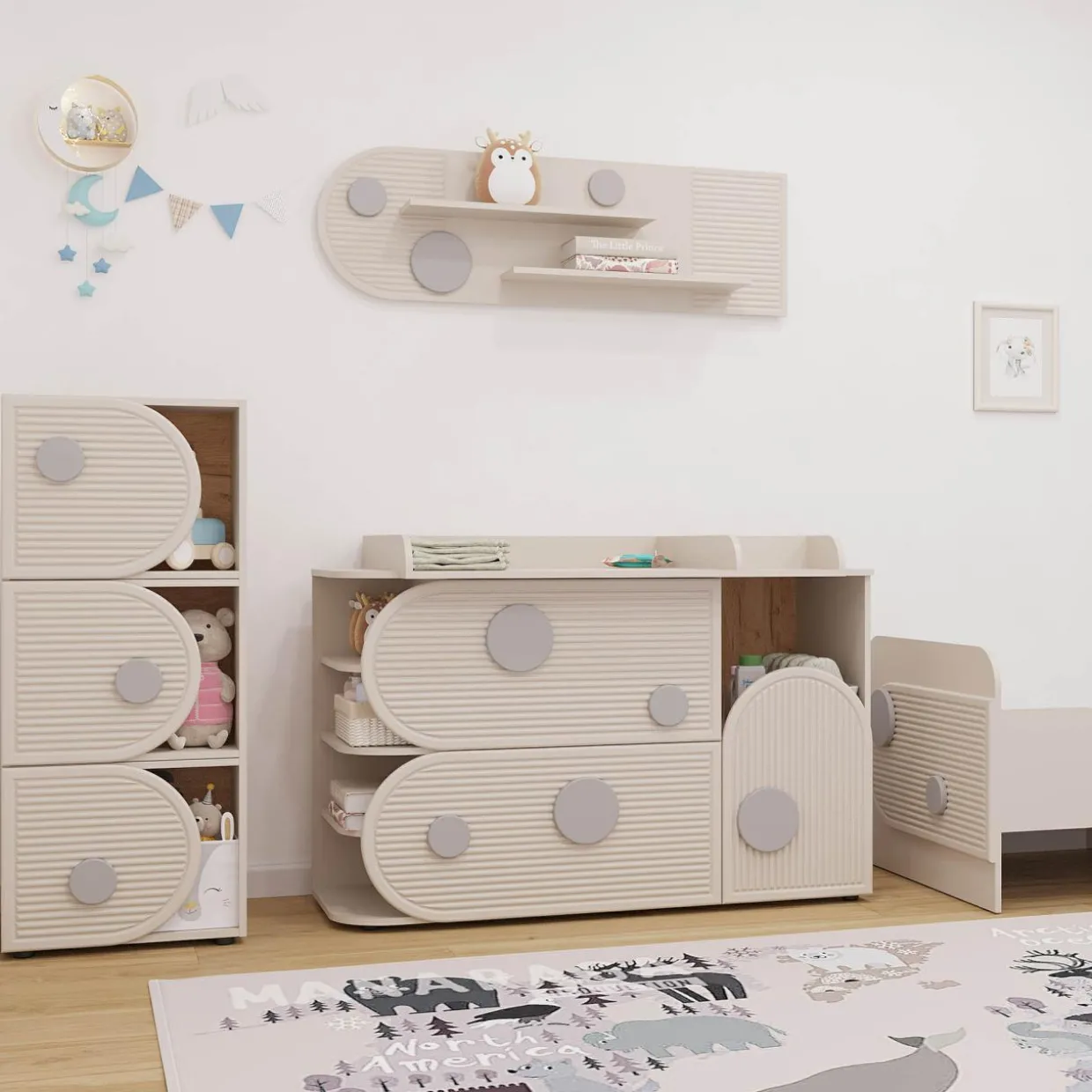 - Delikatne ryflowanie i szare elementy dekoracyjne świetnie wpiszą się w nowoczesne wnętrze, a także podkreślą dziecięcą kreatywność.