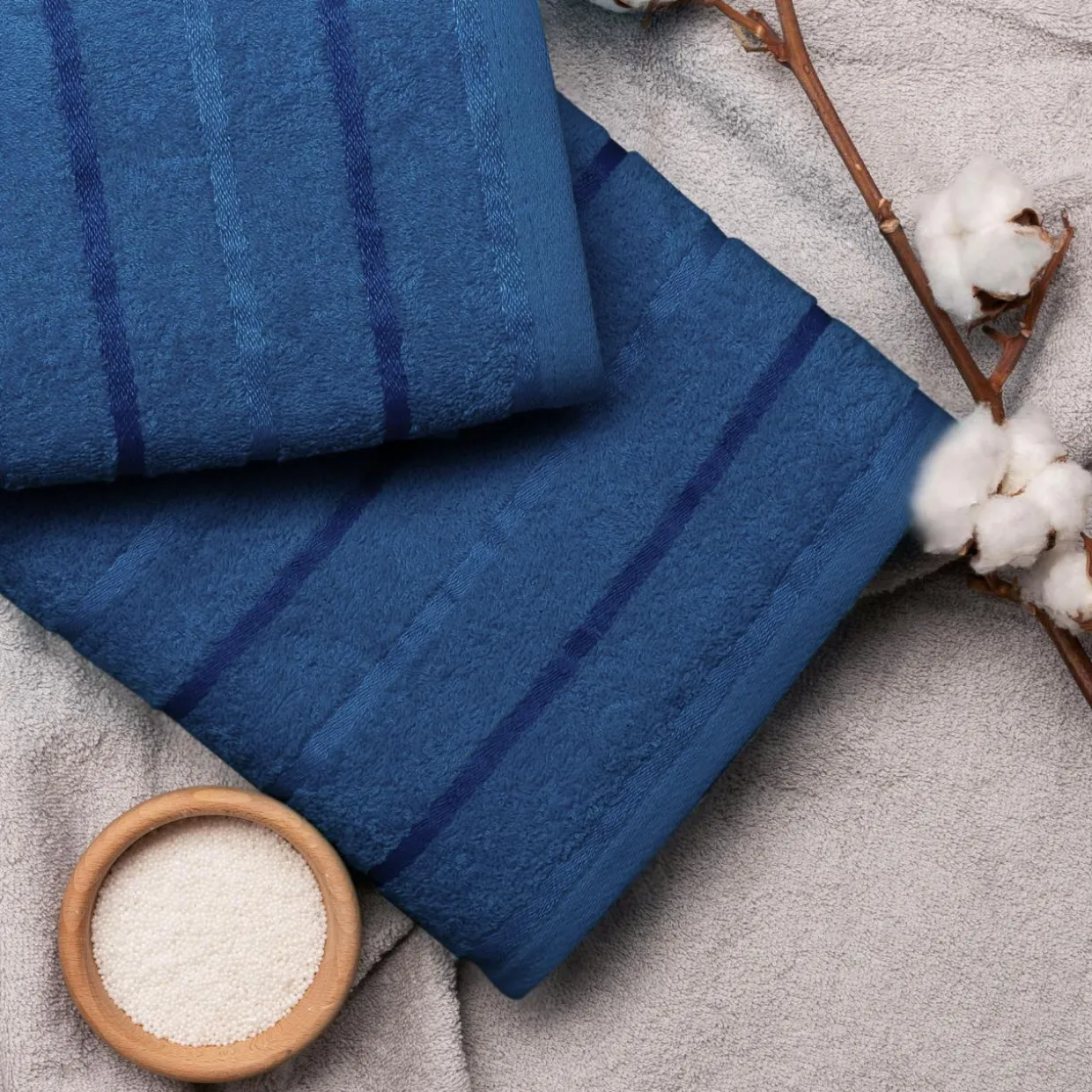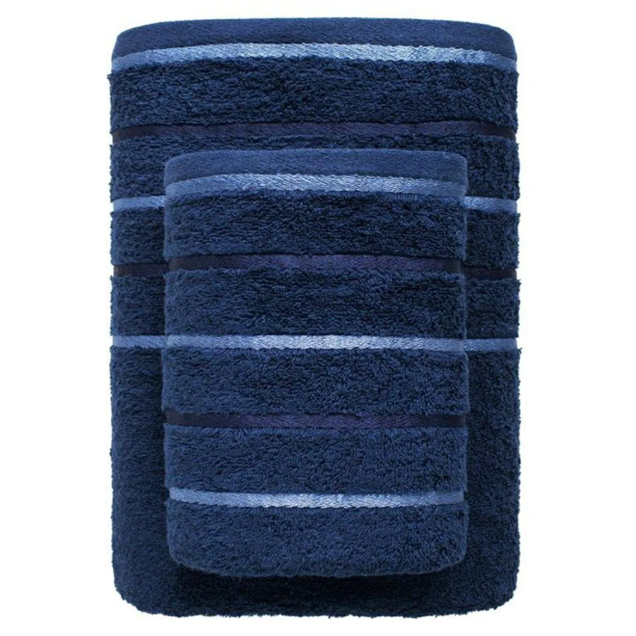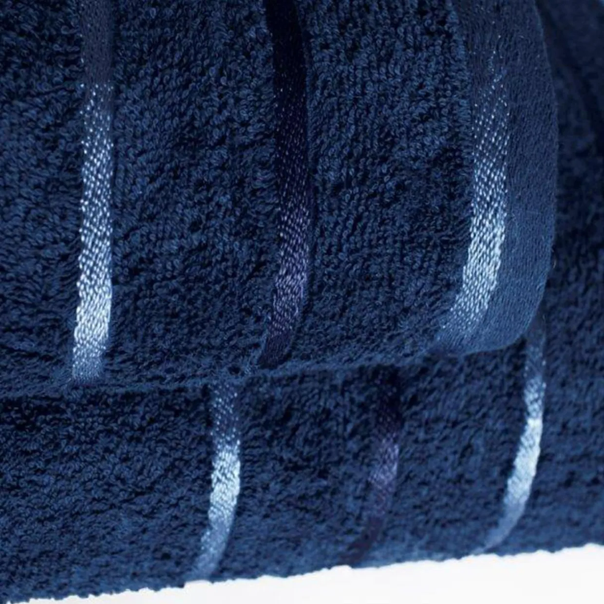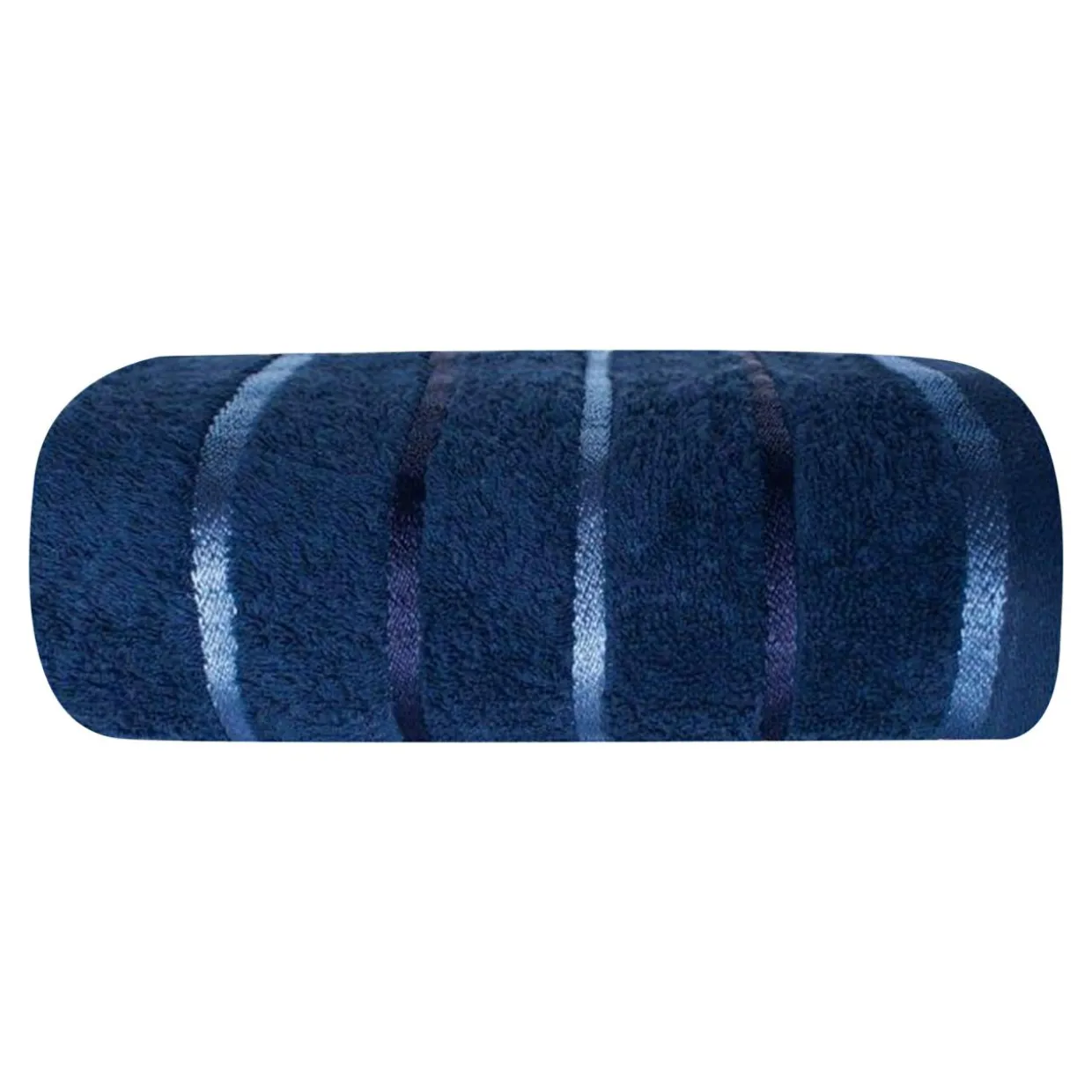 Ręcznik z kolekcji FRESH o wymiarach 50×90 cm w granatowym kolorze będzie pasował do jasnej łazienki w stylu marynistycznym i nowoczesnym.