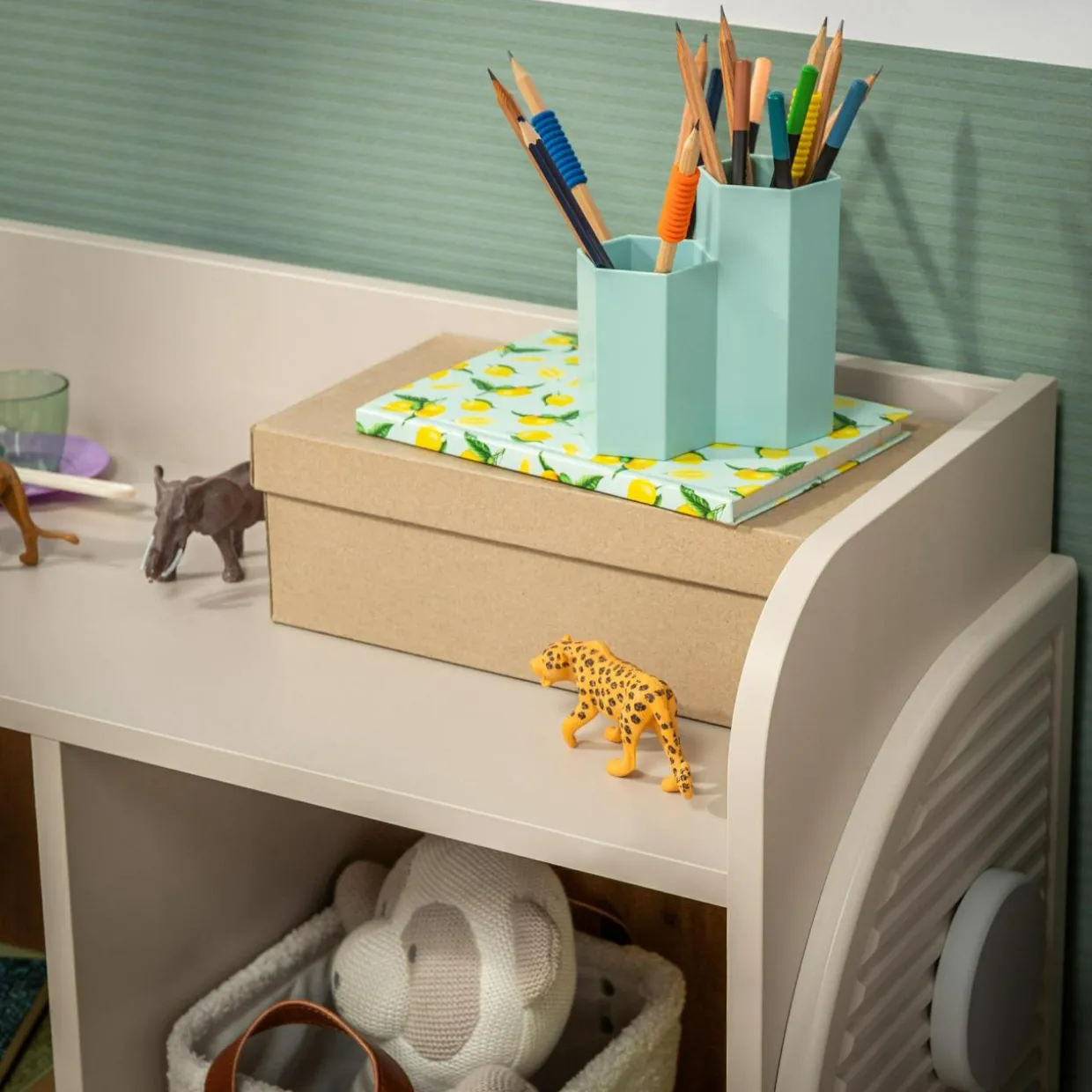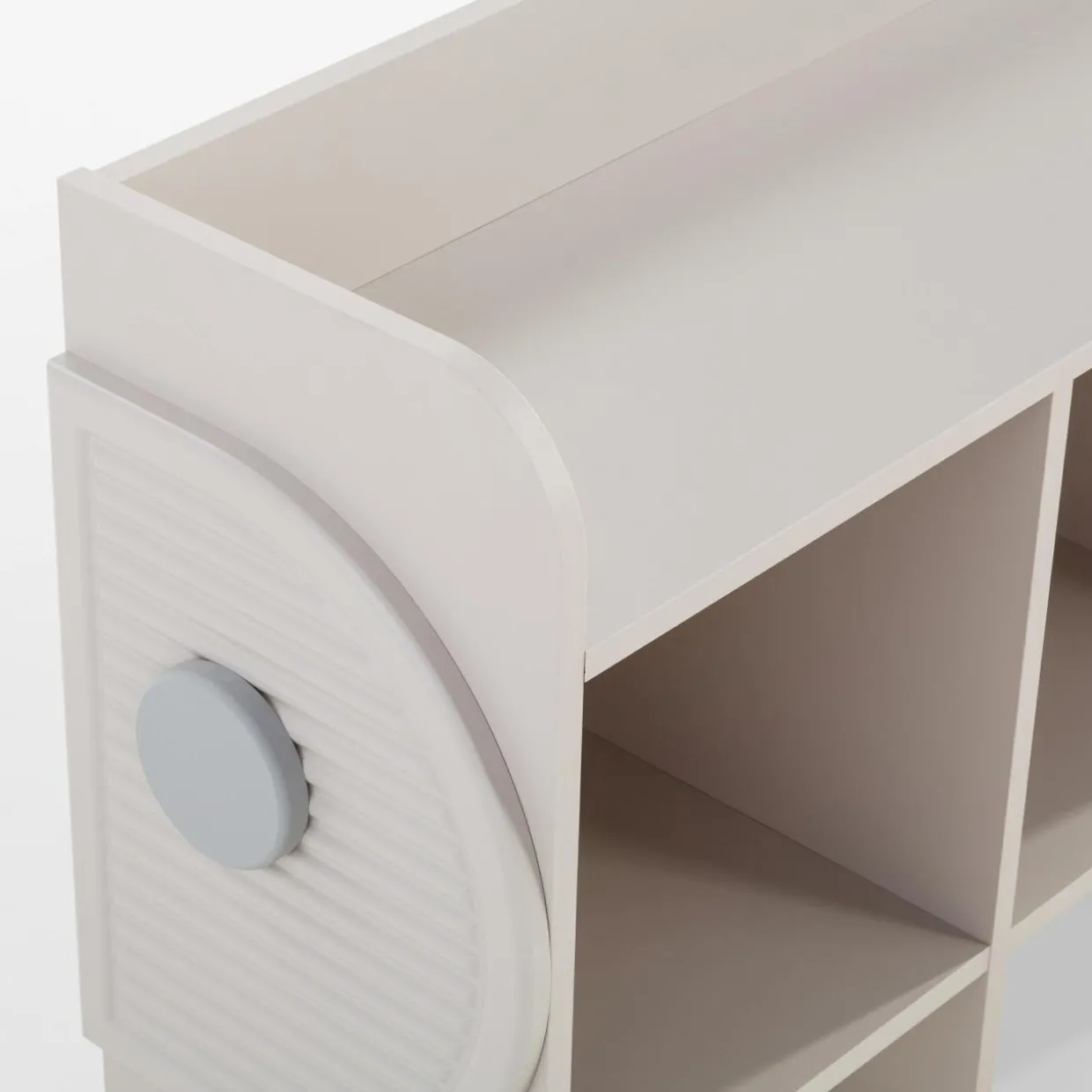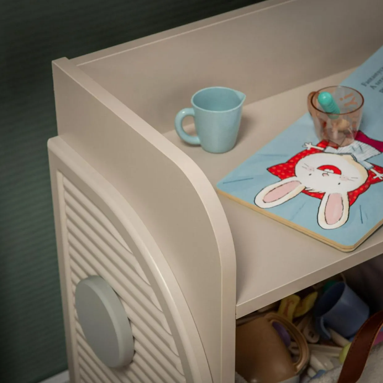 - Delikatne ryflowanie i szare elementy dekoracyjne świetnie wpiszą się w nowoczesne wnętrze, a także podkreślą dziecięcą kreatywność.