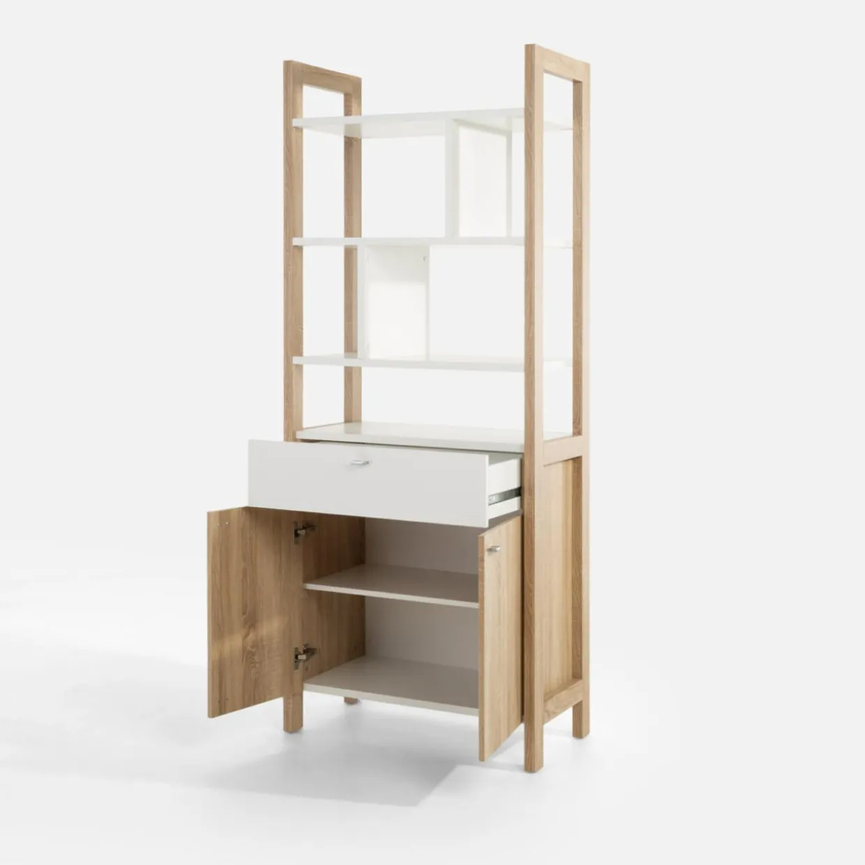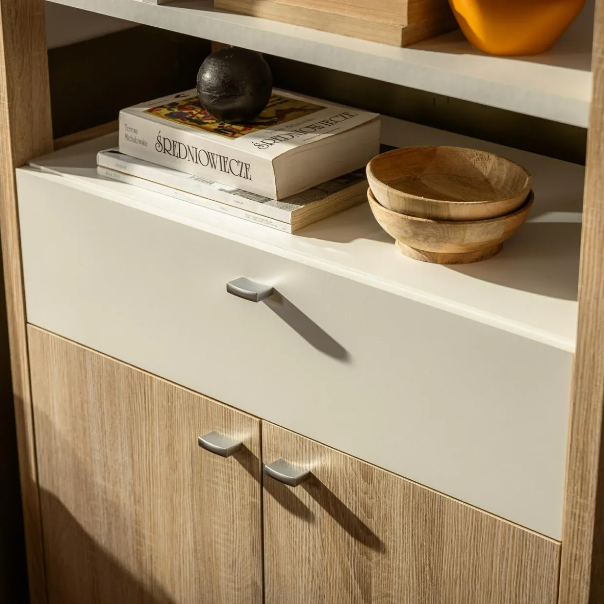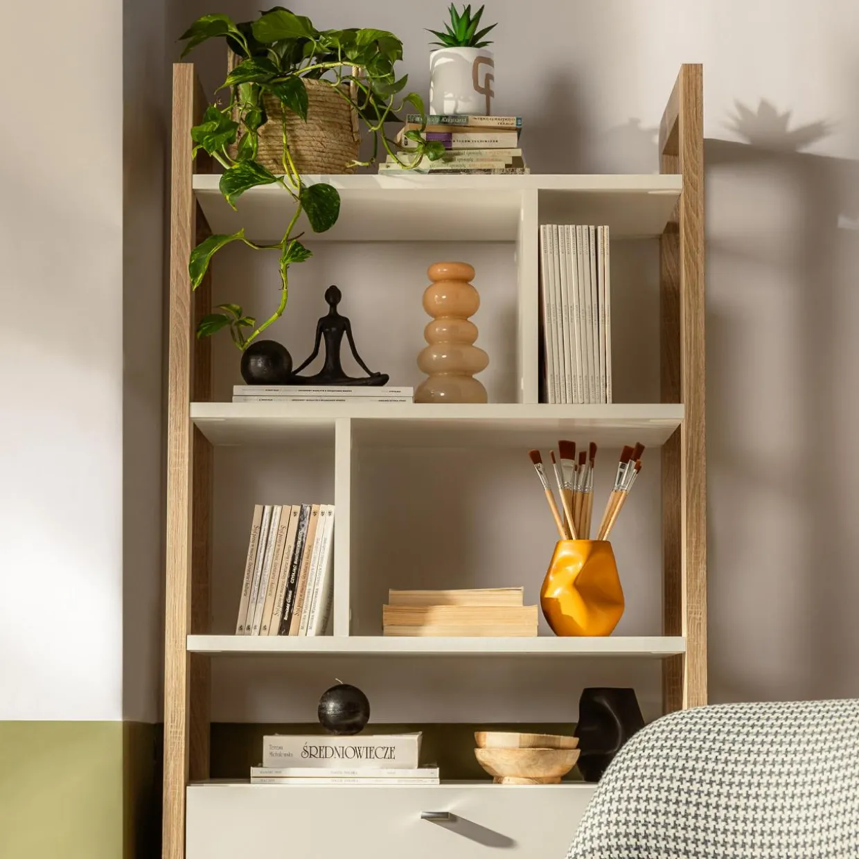 - W 6 otwartych wnękach ułożysz segregatory lub teczki z dokumentami. Nie zabraknie też miejsca na stylowy dodatek lub ramkę ze zdjęciem;