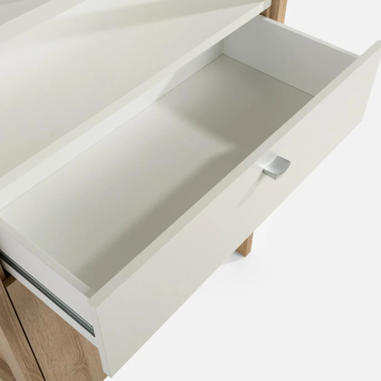 - Wykończenie utrzymane jest w barwie dębu sonoma połączonej z bielą. Dzięki temu wnętrze staje się bardziej przytulne i cieplejsze;