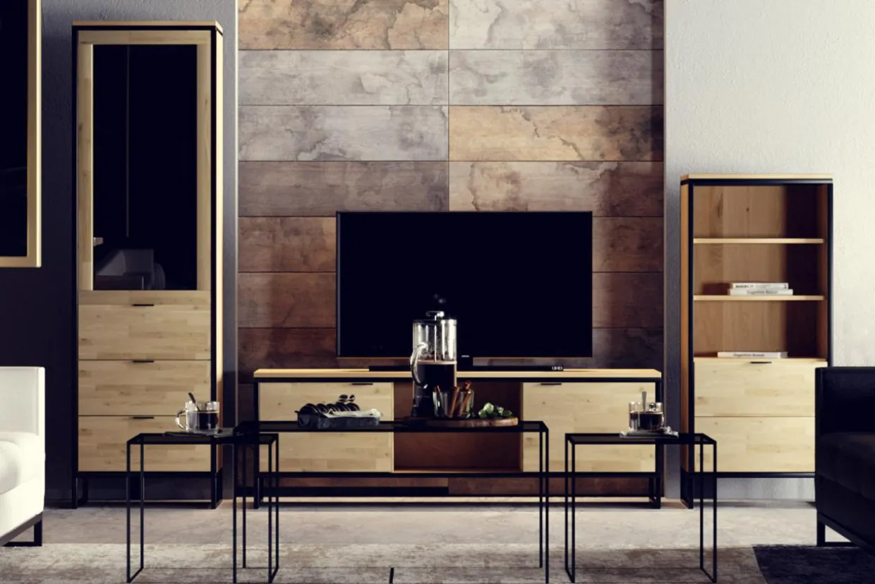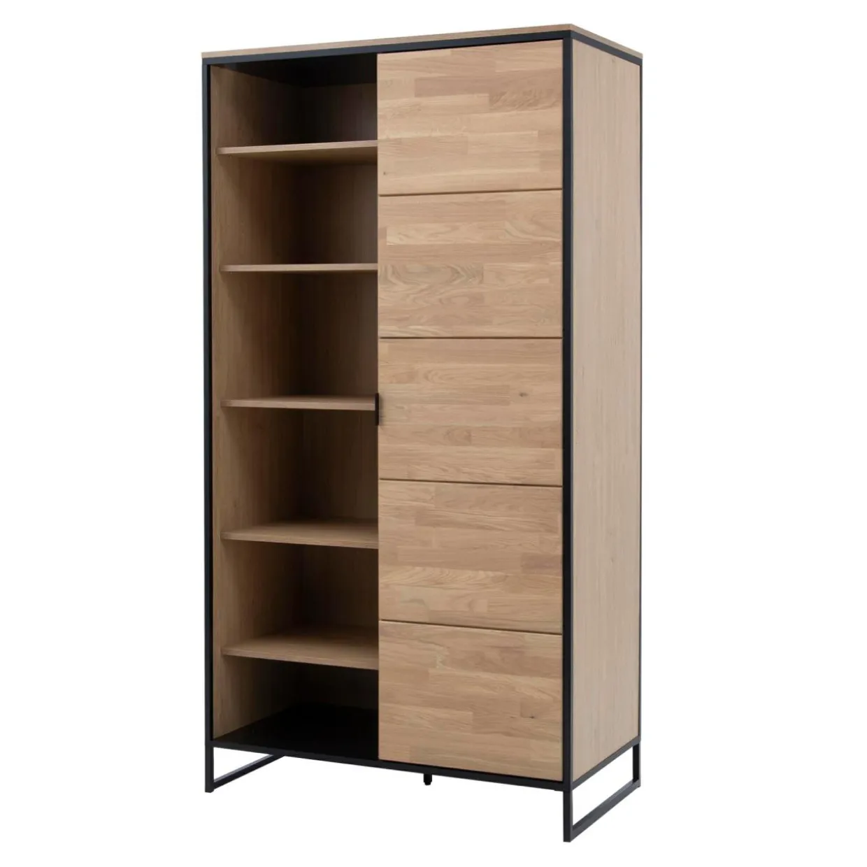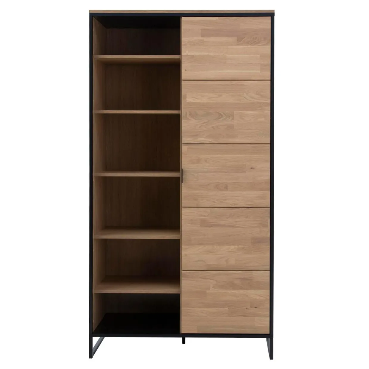 Regał w kolorze dębowego drewna połączonego z czarnymi elementami doskonale wpasuje się w nowoczesne przestrzenie inspirowane stylem industrialnym.