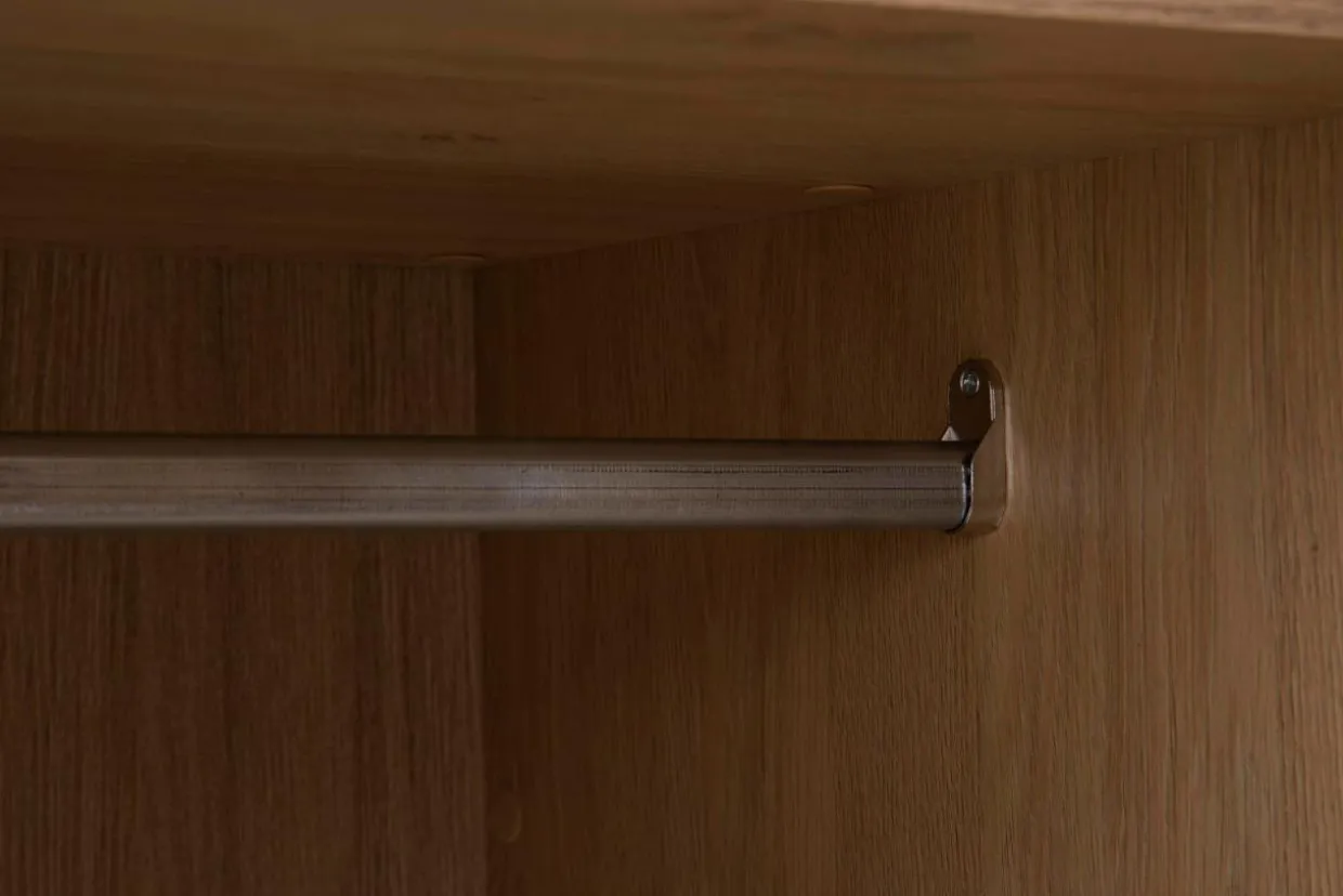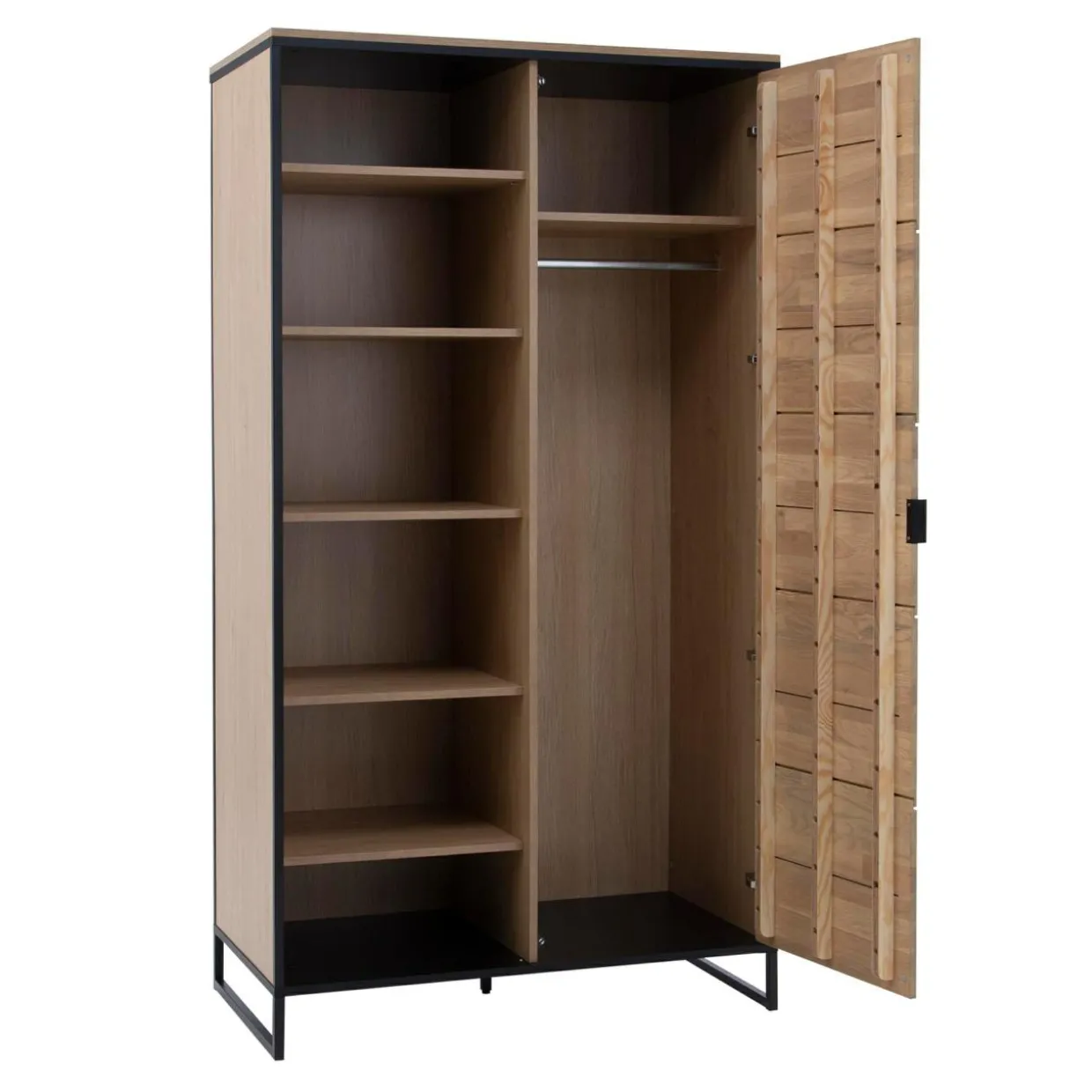 - Regał wysoki KING to mebel o ukrytym talencie, za frontem z wykonanym z listw litego drewna, kryje się wieszak na sweter lub marynarkę.