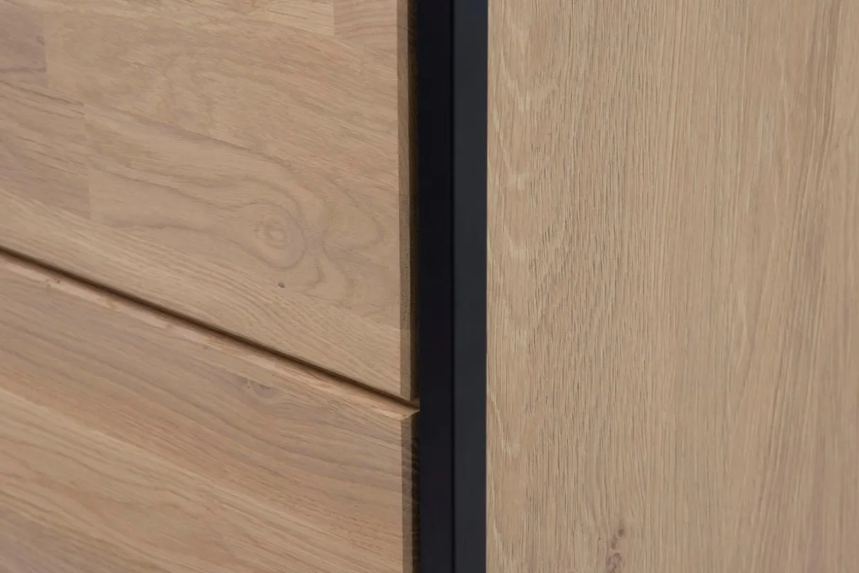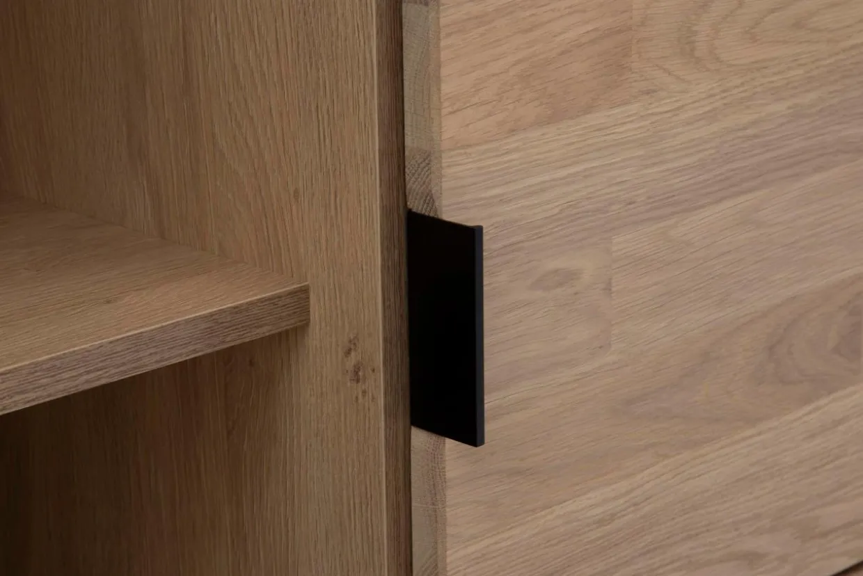 - Regał KING wykończono w jasnym, dębowym odcieniu drewna, z wyraźnie zaznaczonymi sękami, które jeszcze bardziej podkreślą charakter mebla.