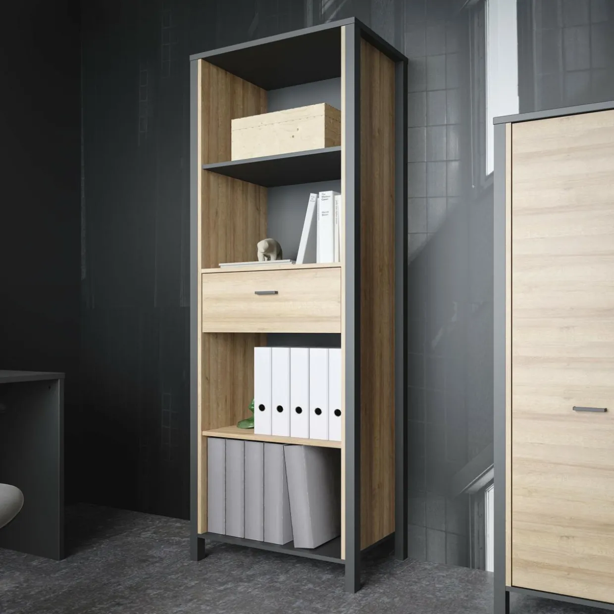 - Regał posiada 1 szufladę, wyposażoną w prowadnice kulkowe oraz 4 otwarte wnęki.