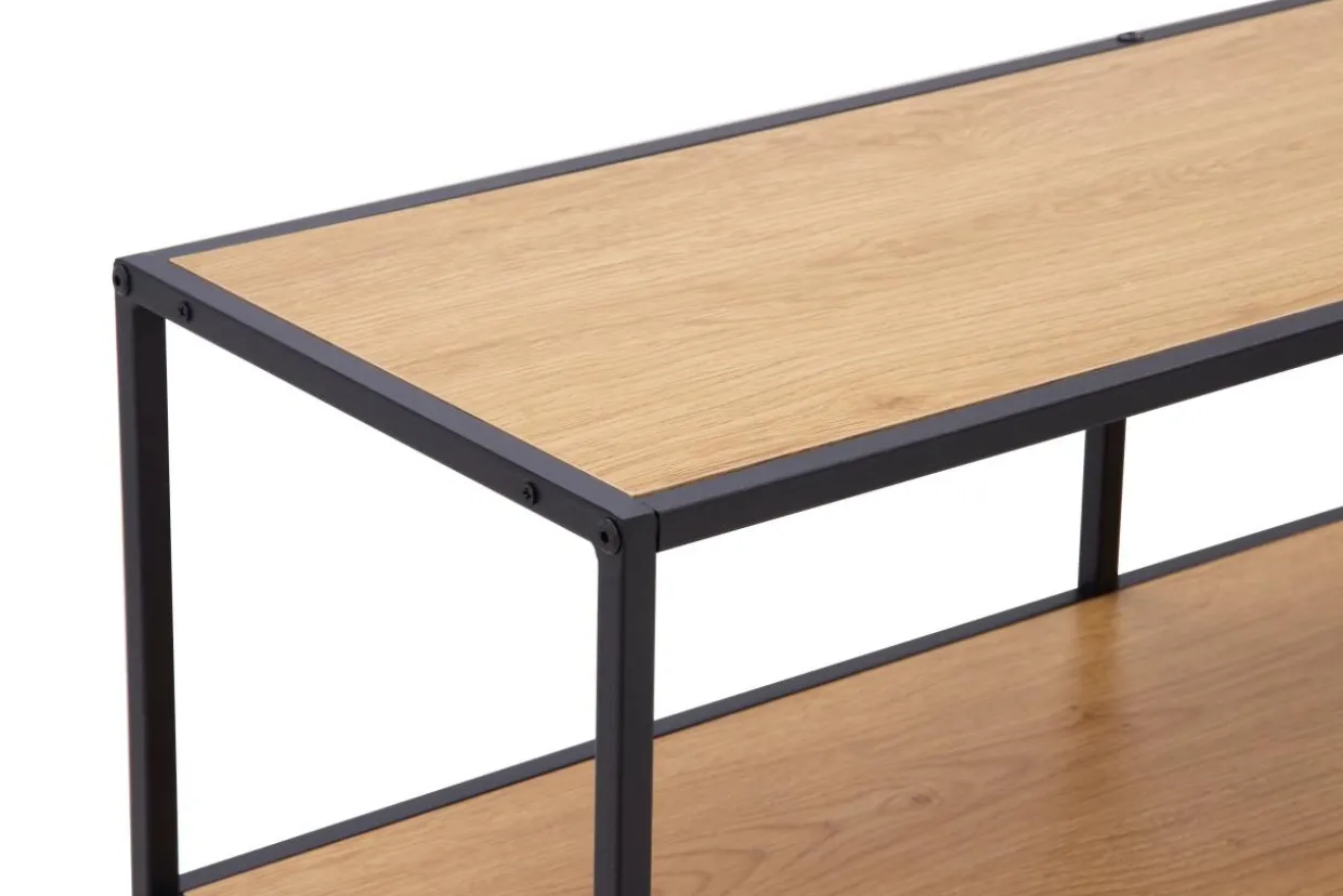 Zestawienie koloru jasnego drewna z metalowym, czarnym stelażem wprowadza do wnętrza nowoczesny klimat.