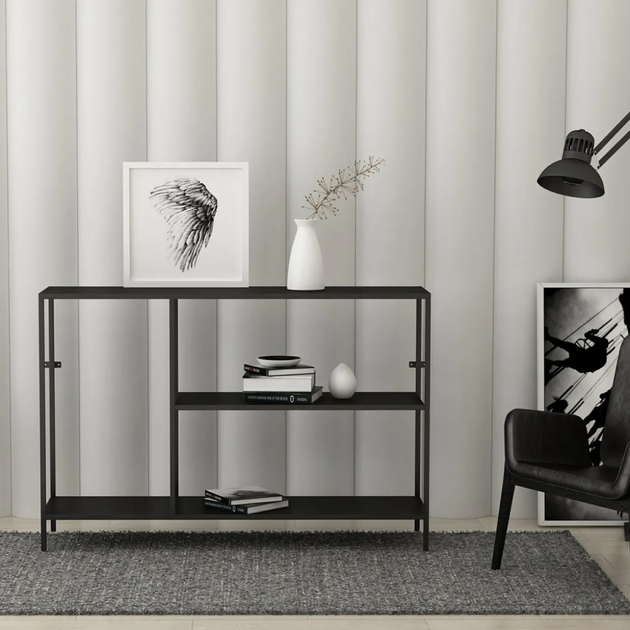 Nowoczesna geometryczna bryła regału wpasuje się w industrialne pomieszczenia.