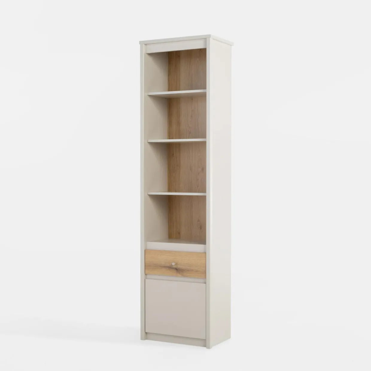Regał KARIN składa się z kilku otwartych półek, jednej szuflady oraz zamykanej szafki w dolnej części. Półki umożliwiają łatwe wyeksponowanie książek, dekoracji, czy innych przedmiotów, które chcesz mieć na widoku i pod ręką.