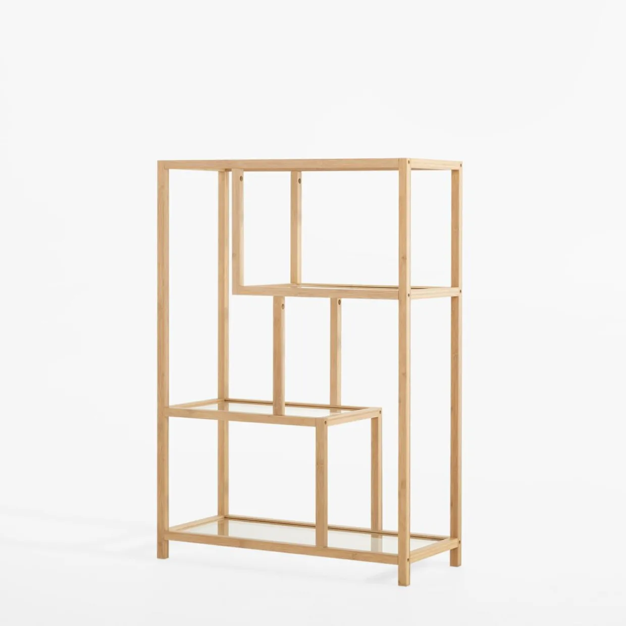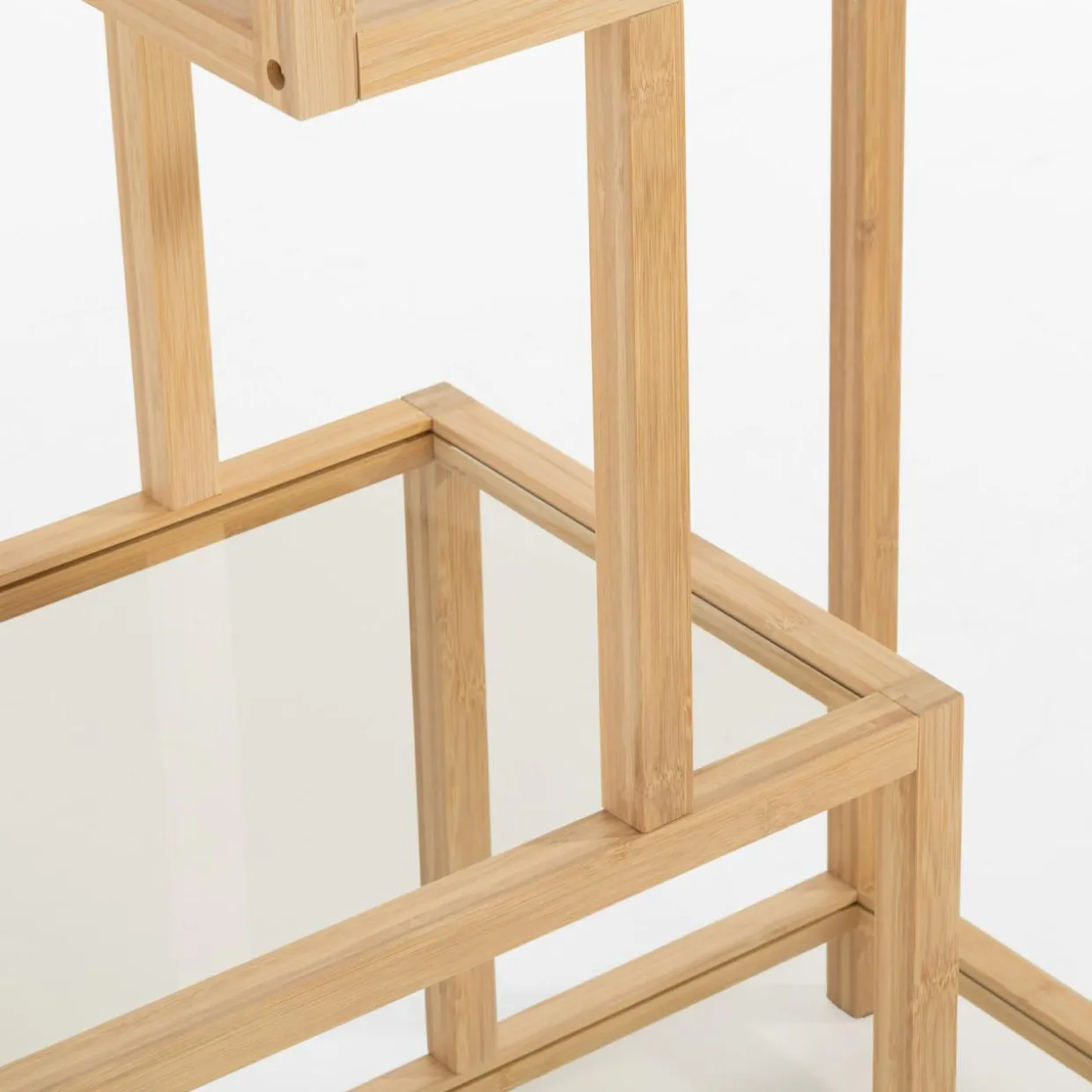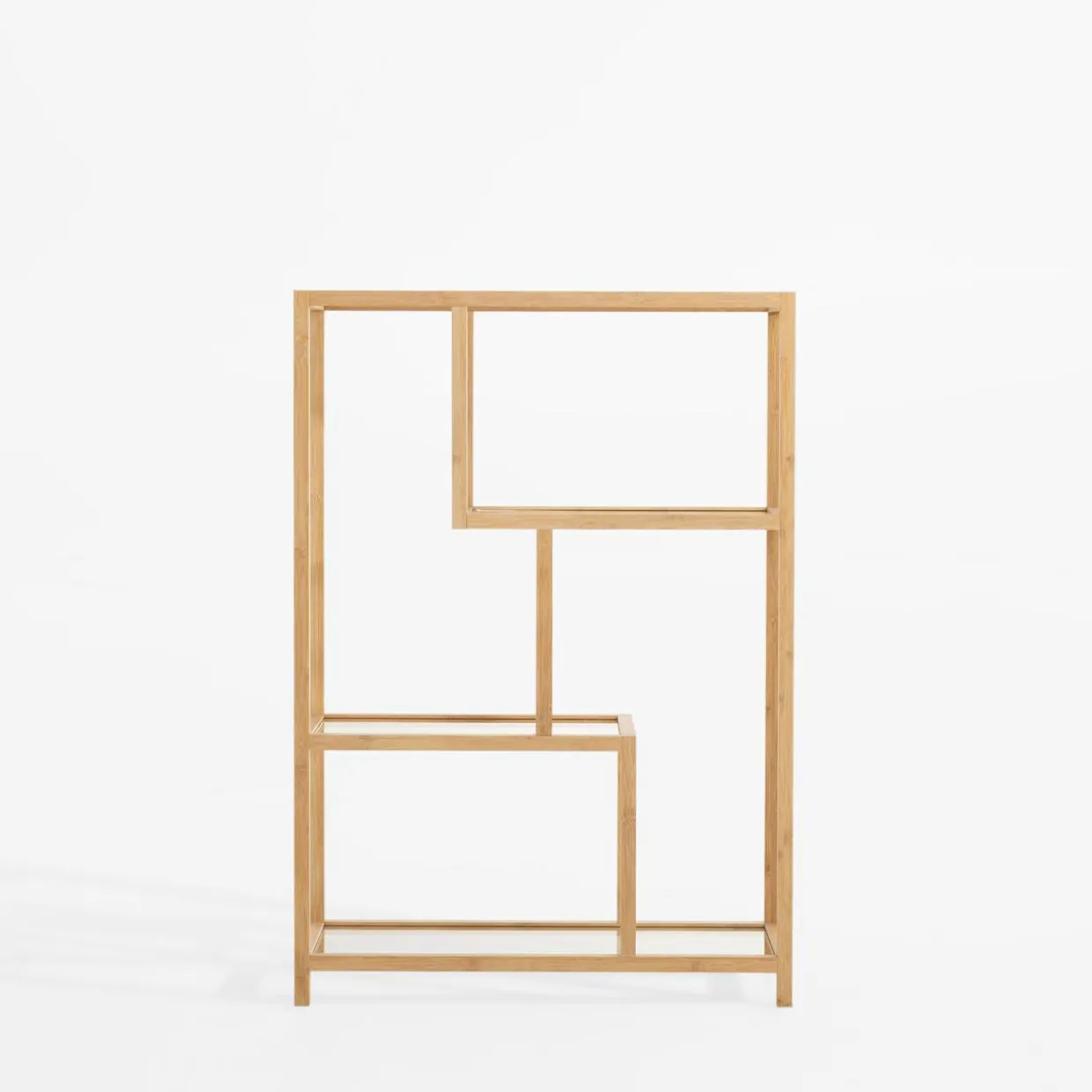 Regał HORO pasuje do stylu boho oraz minimalistycznych wnętrz. Konstrukcja z jasnego drewna bambusowego i szklane półki dodają mu lekkości, a nietypowy układ półek wprowadza nowoczesny akcent.
