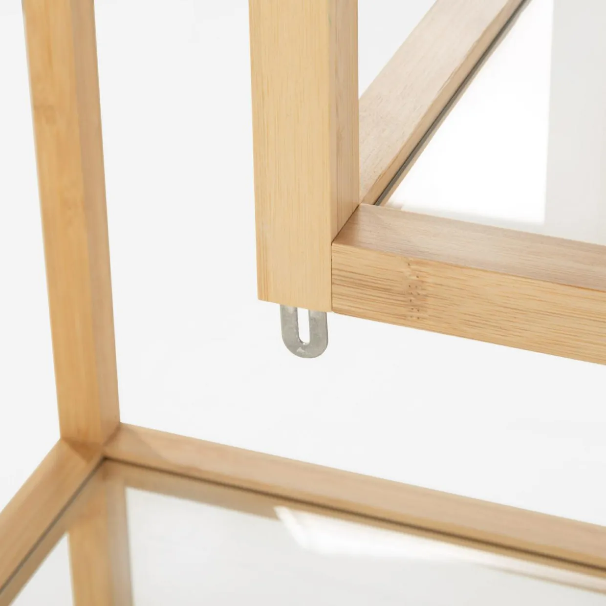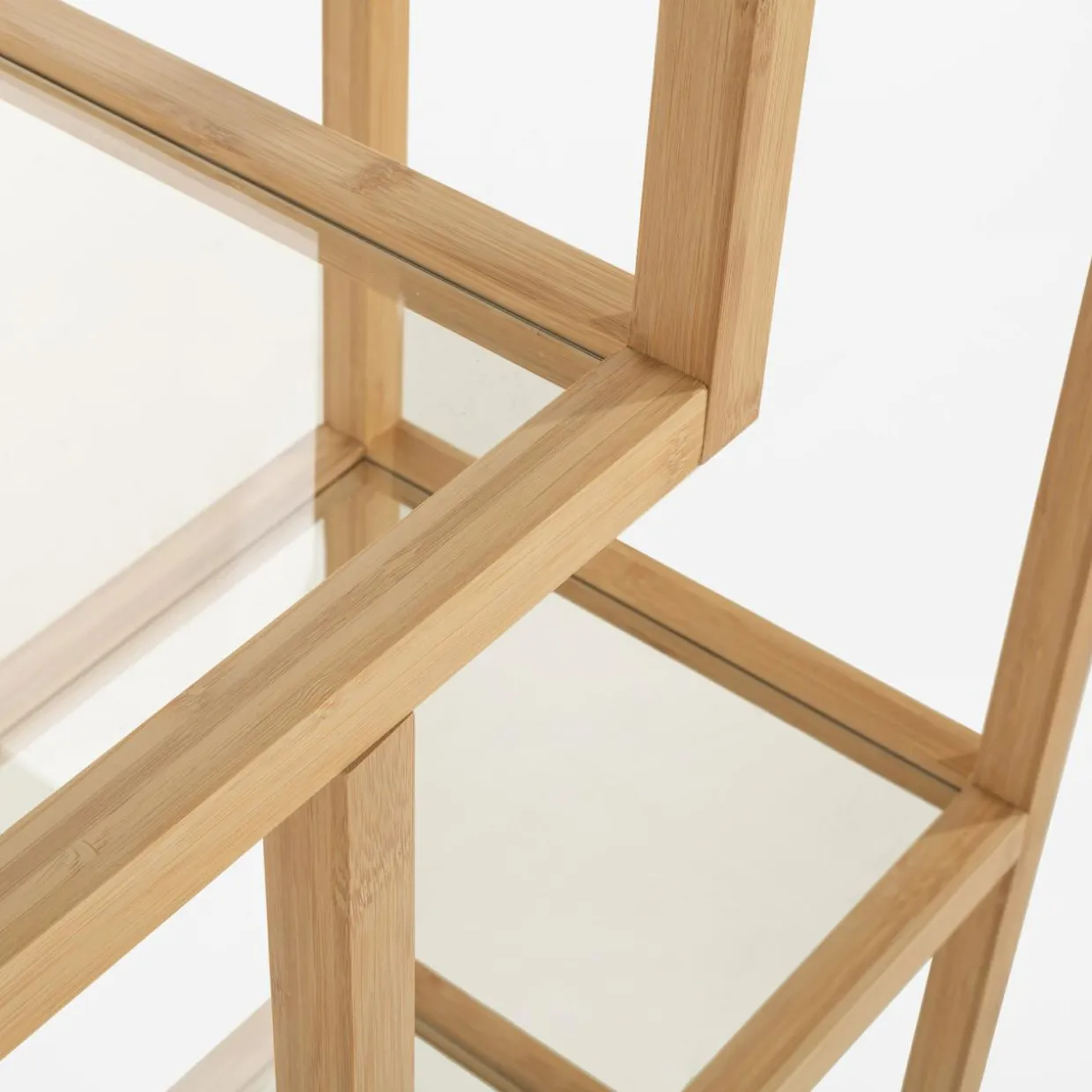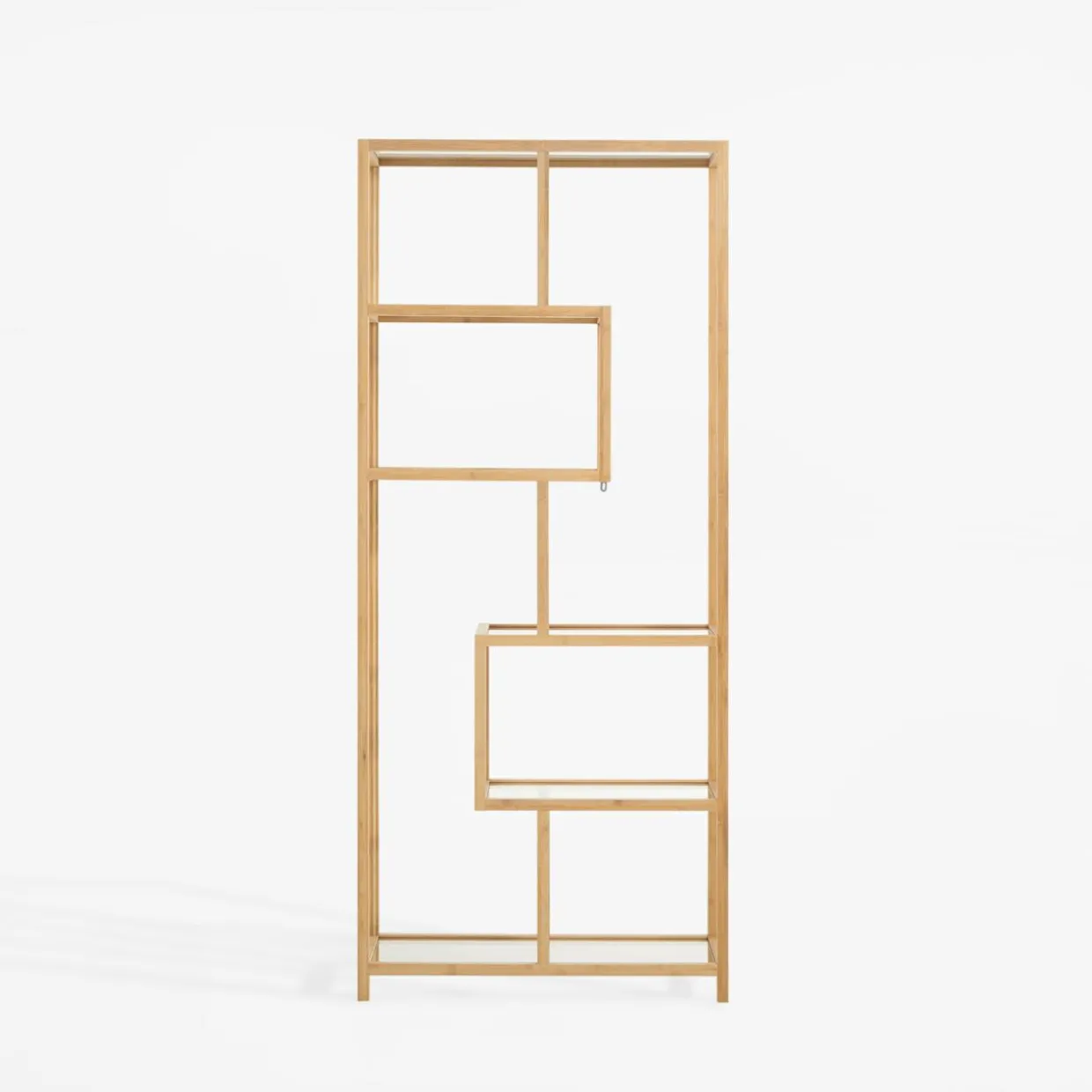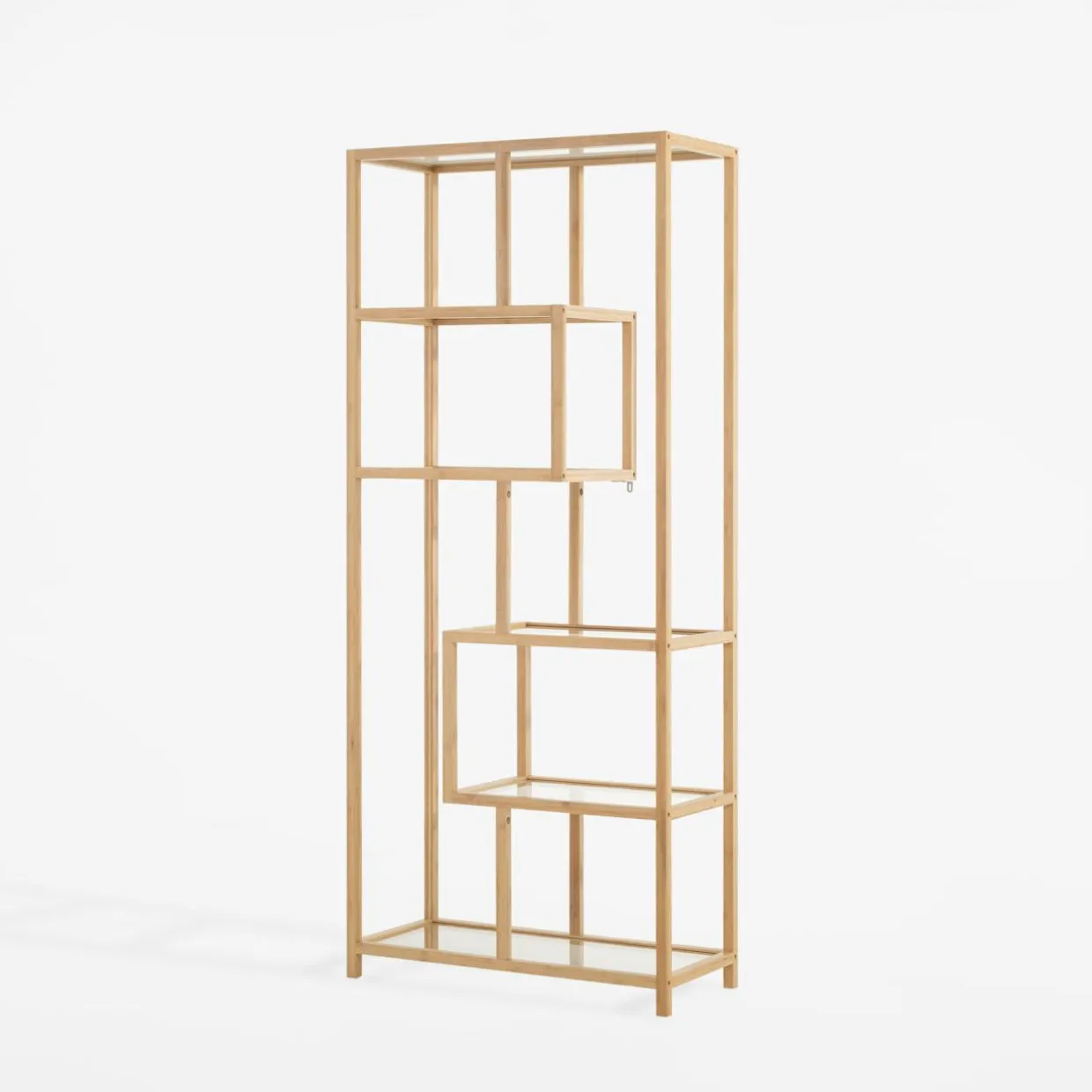 Regał HORO pasuje do wnętrz urządzonych w stylu boho i minimalistycznym. Naturalne drewno bambusowe i jasne szkło hartowane nadają mu lekkości, a nietuzinkowy układ półek wprowadza nowoczesny akcent.