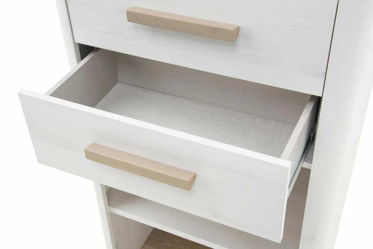 Na powierzchni białego korpusu możesz obserwować subtelny rysunek drewna. Estetycznie prezentuje się w jasnych wnętrzach.