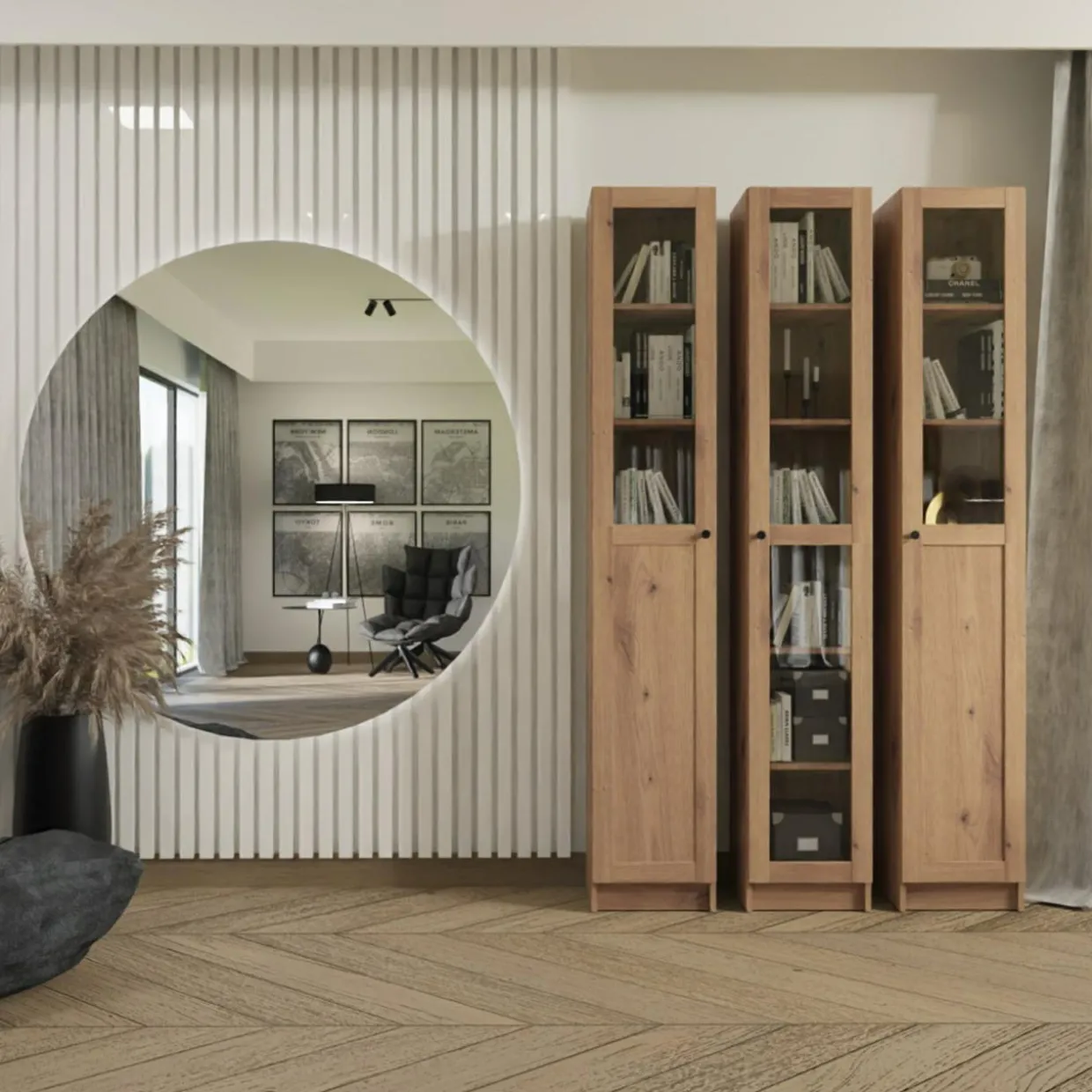 - Wąski mebel świetnie sprawdzi się jako uzupełnienie przestrzeni między pozostałymi meblami a ścianą lub zabudowa we wnęce.