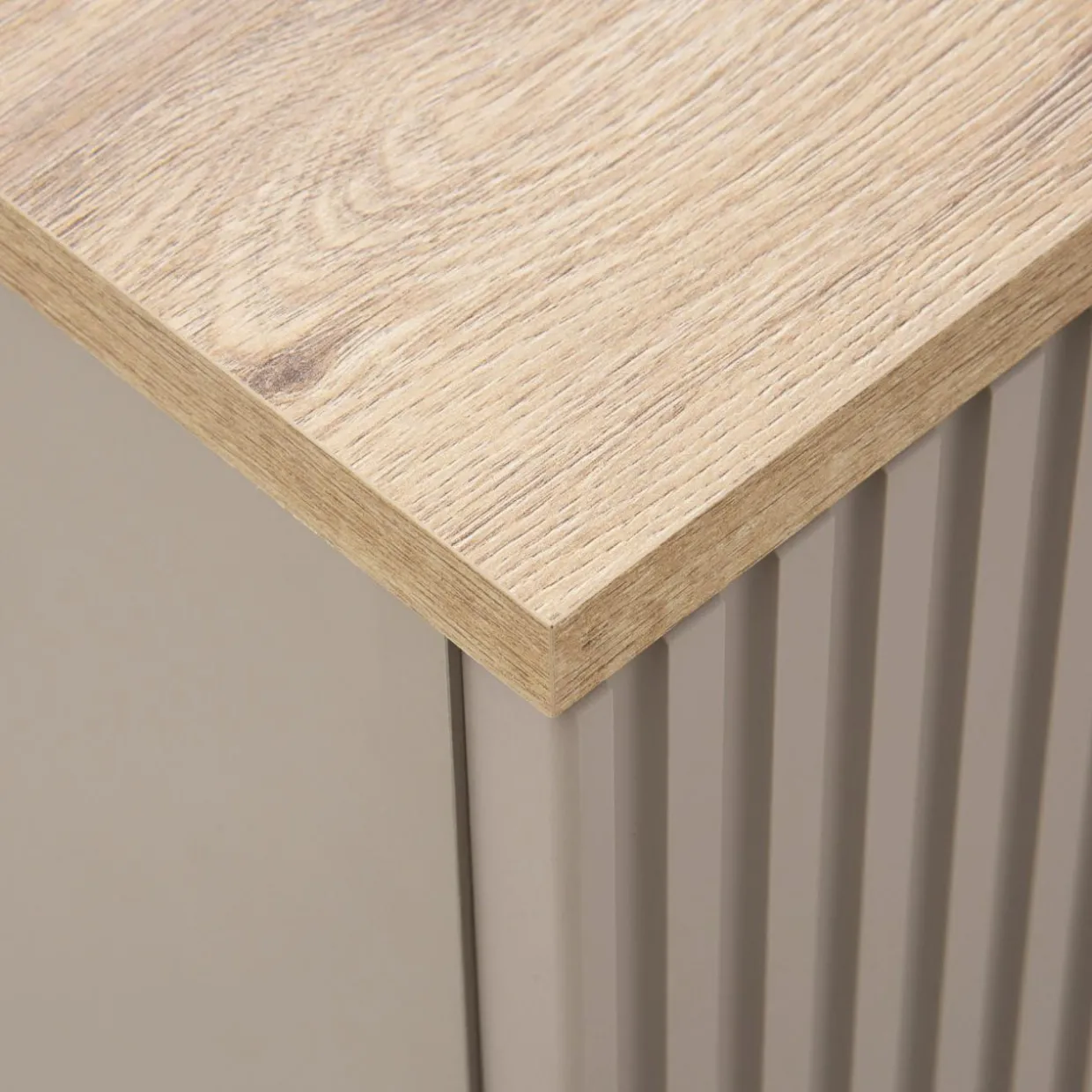 - Ryflowane fronty w kolorze taupe idealnie zgrywają się z korpusami. Wykończone są laminatem i folią.