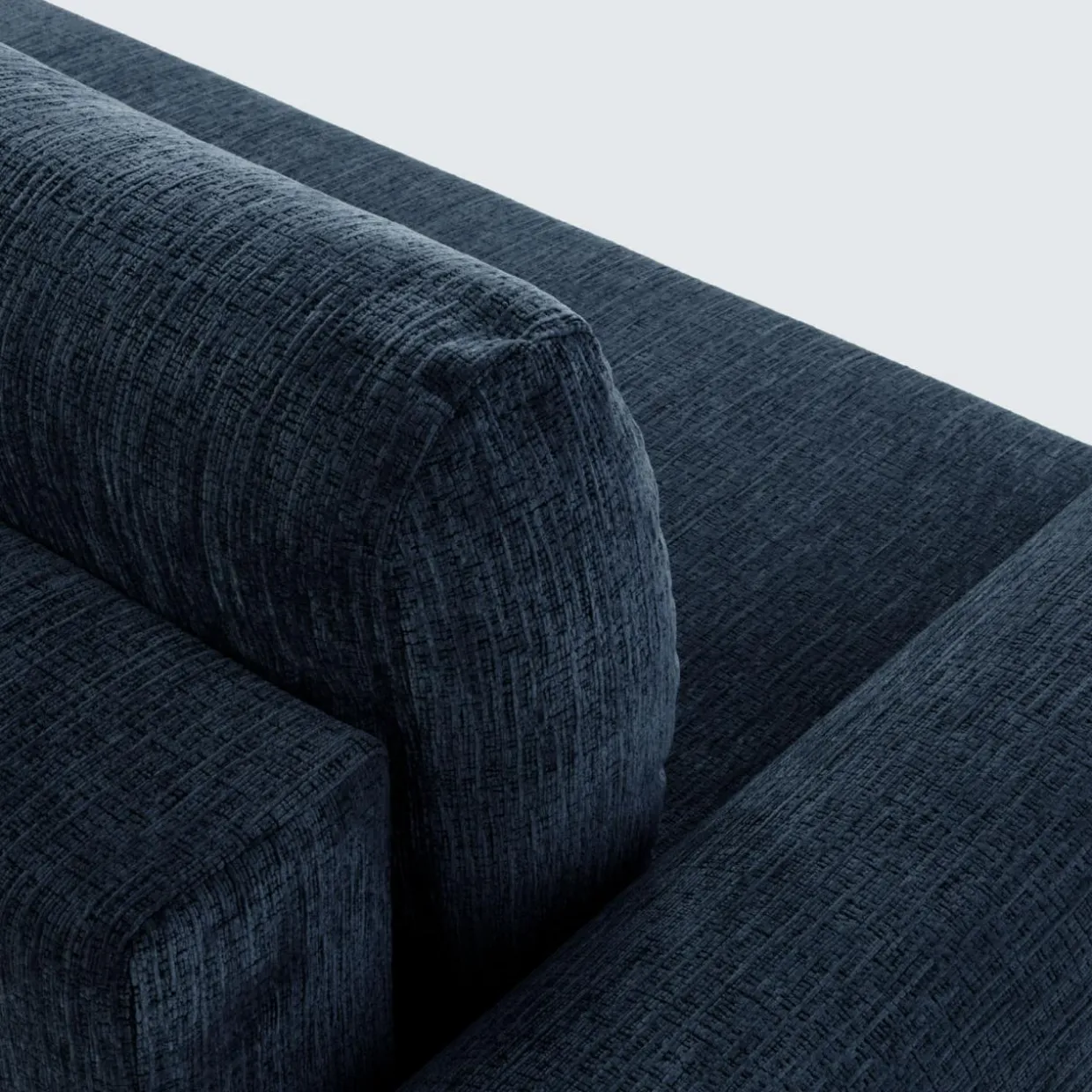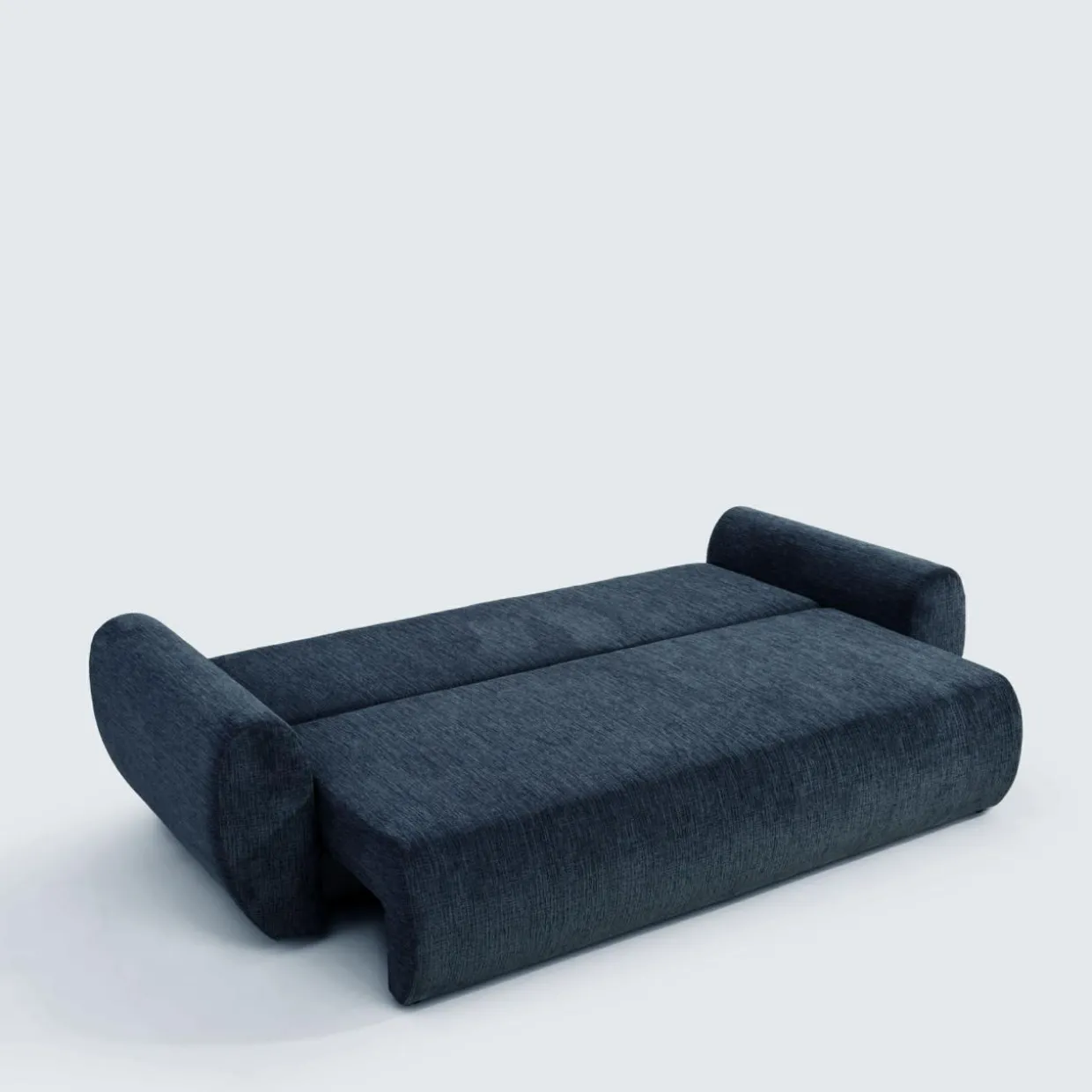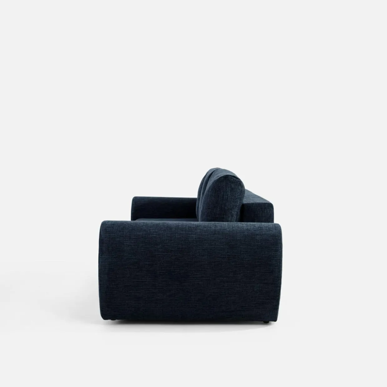 Ciemnoniebieska sofa DOLLY z tkaniny o wyraźnej strukturze sprawdzi się w salonie jako miejsce do wypoczynku i okazjonalnego przenocowania gości.