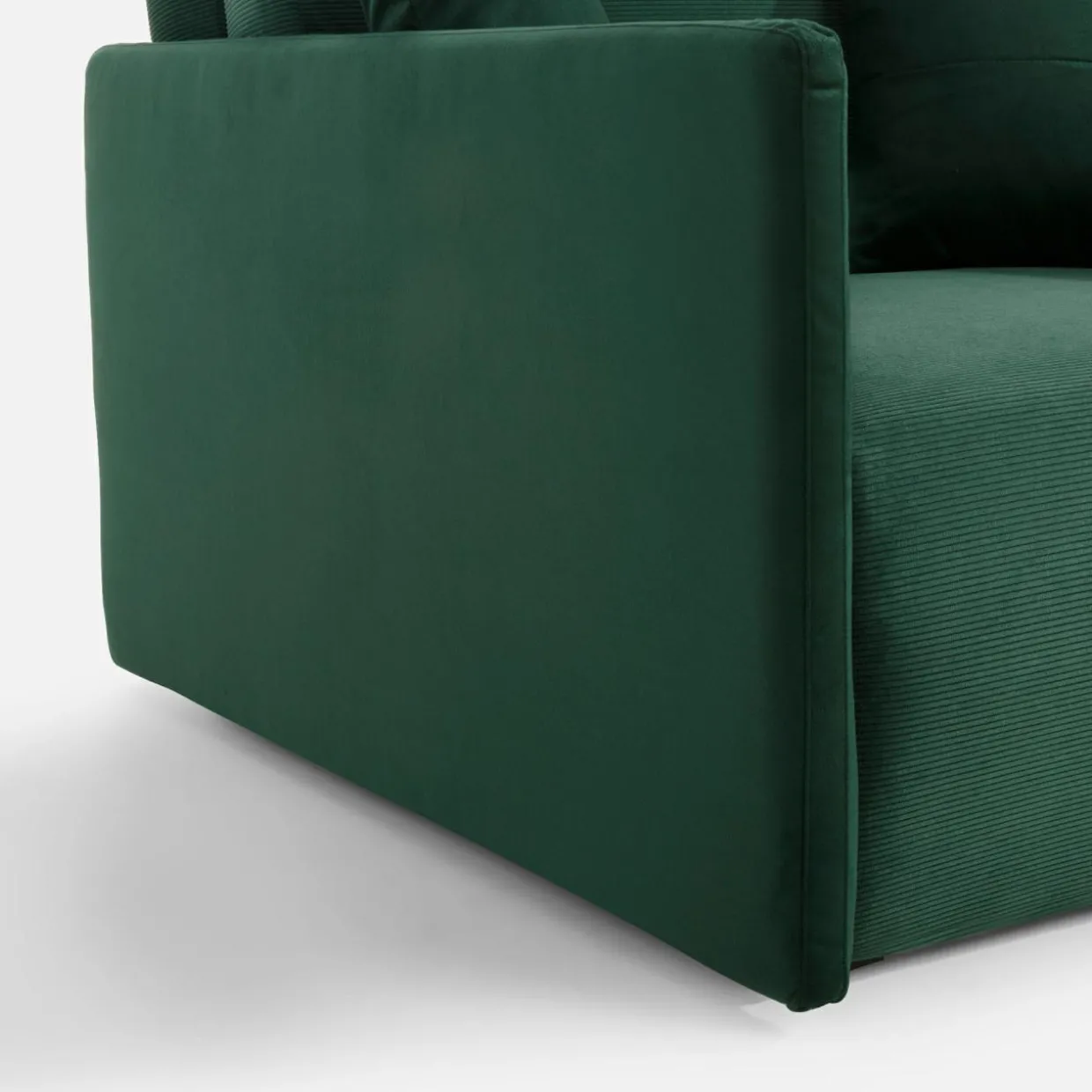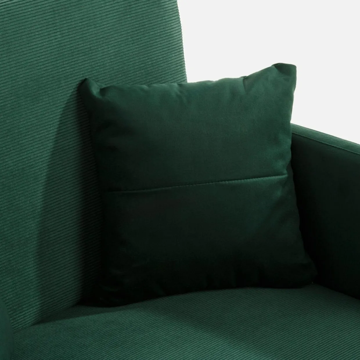 Sofa MIKA w zielonym butelkowym odcieniu to kompaktowy mebel, który doskonale sprawdzi się w kawalerce, pełniąc funkcję fotela i dodatkowego miejsca do spania dla gości.