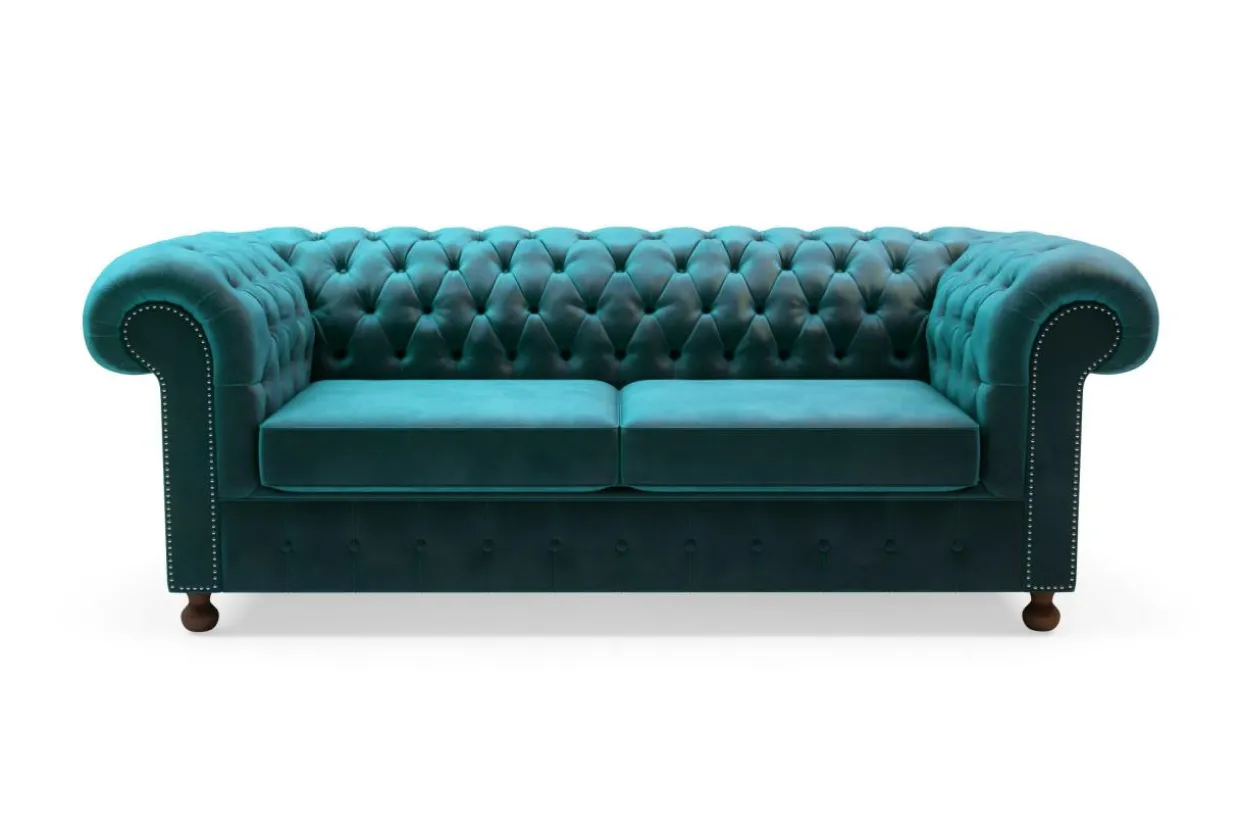 Niezwykle ozdobne oparcie sofy zostało pokryte pikowaniem oraz dekoracyjnymi, pokrytymi tkaniną, guzikami. Podłokietniki wywinięte są na zewnątrz na kształt ślimaka.