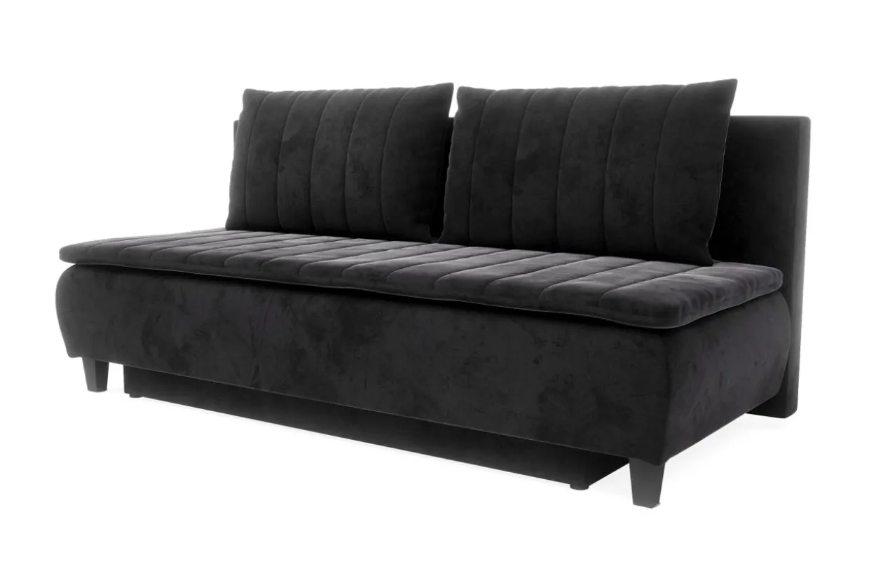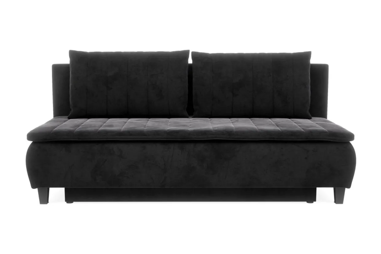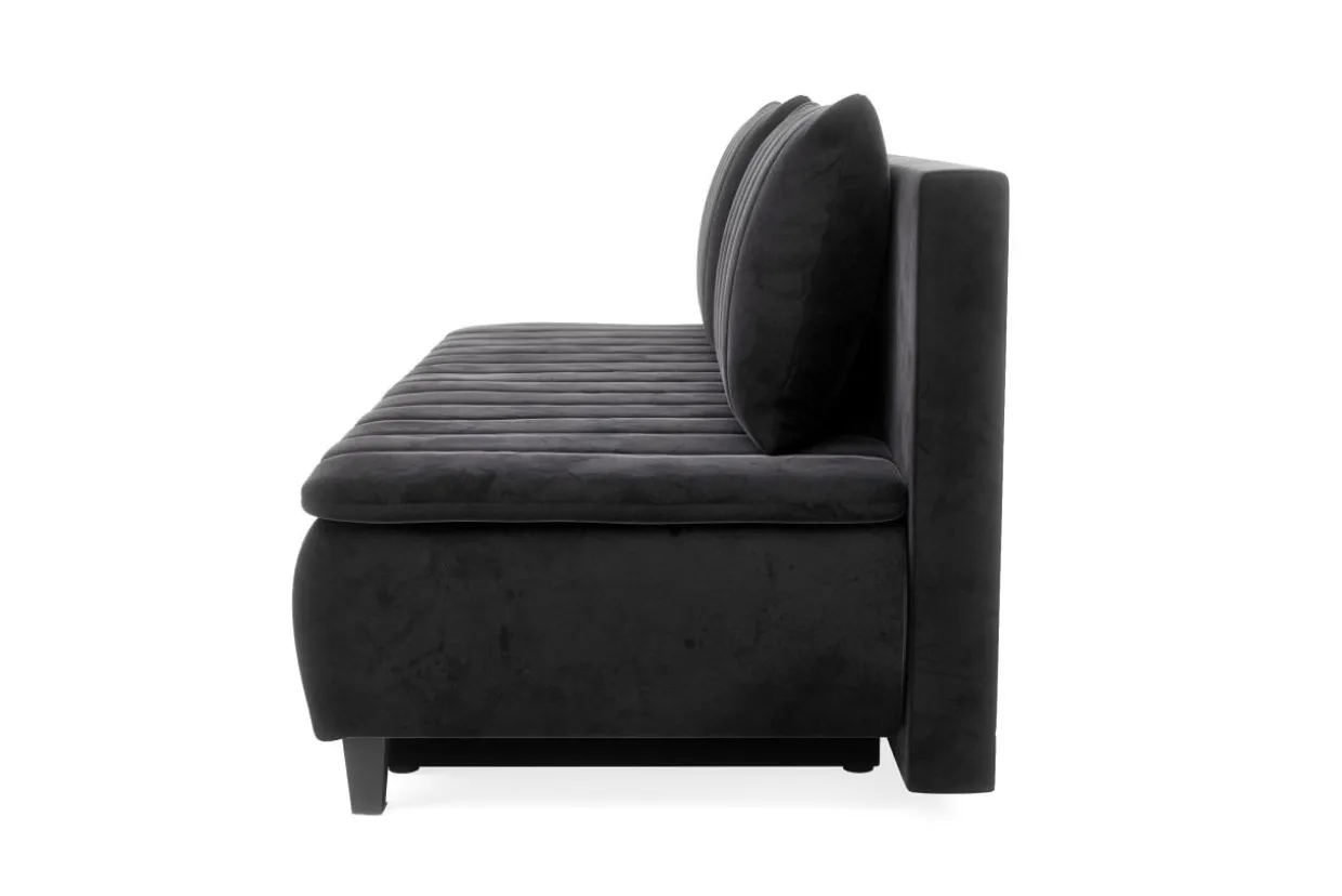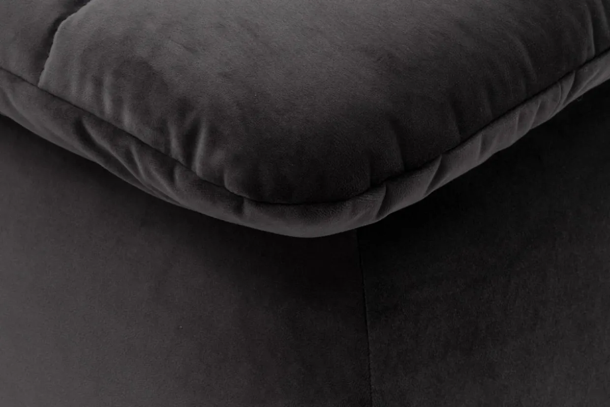 Sofa zachwyca welurową tkaniną o eleganckim, ciemnoszarym odcieniu, która doskonale wpisuje się w najnowsze trendy wnętrzarskie. Sprawia, że mimo swej prostoty mebel prezentuje się szykownie. Możesz wkomponować ją we wnętrza wypełnione beżami, złotem i żółtymi dodatkami.
