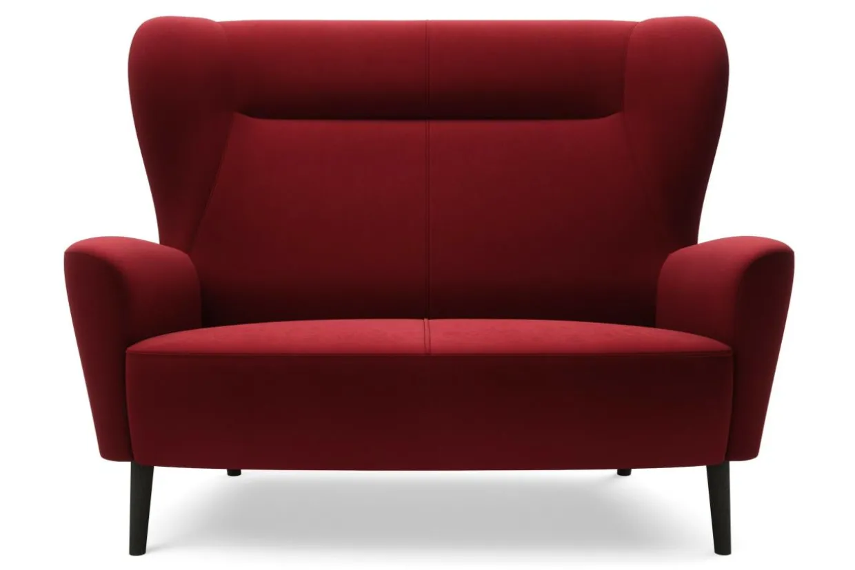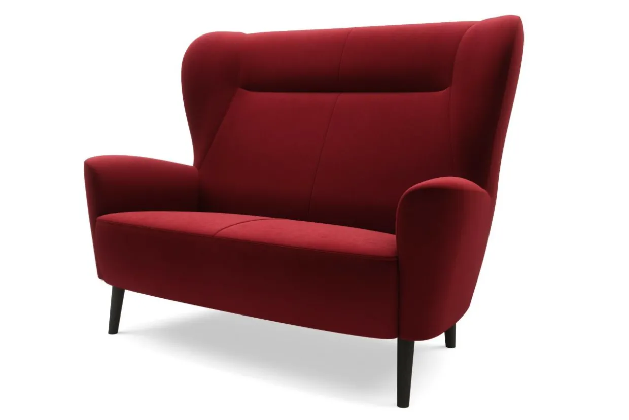 Odważny, ciemnoczerwony kolor, wysokie nóżki i kształt nawiązujący do fotela „uszaka” czynią sofę dekoracyjnym meblem, który będzie główną ozdobą salonu.