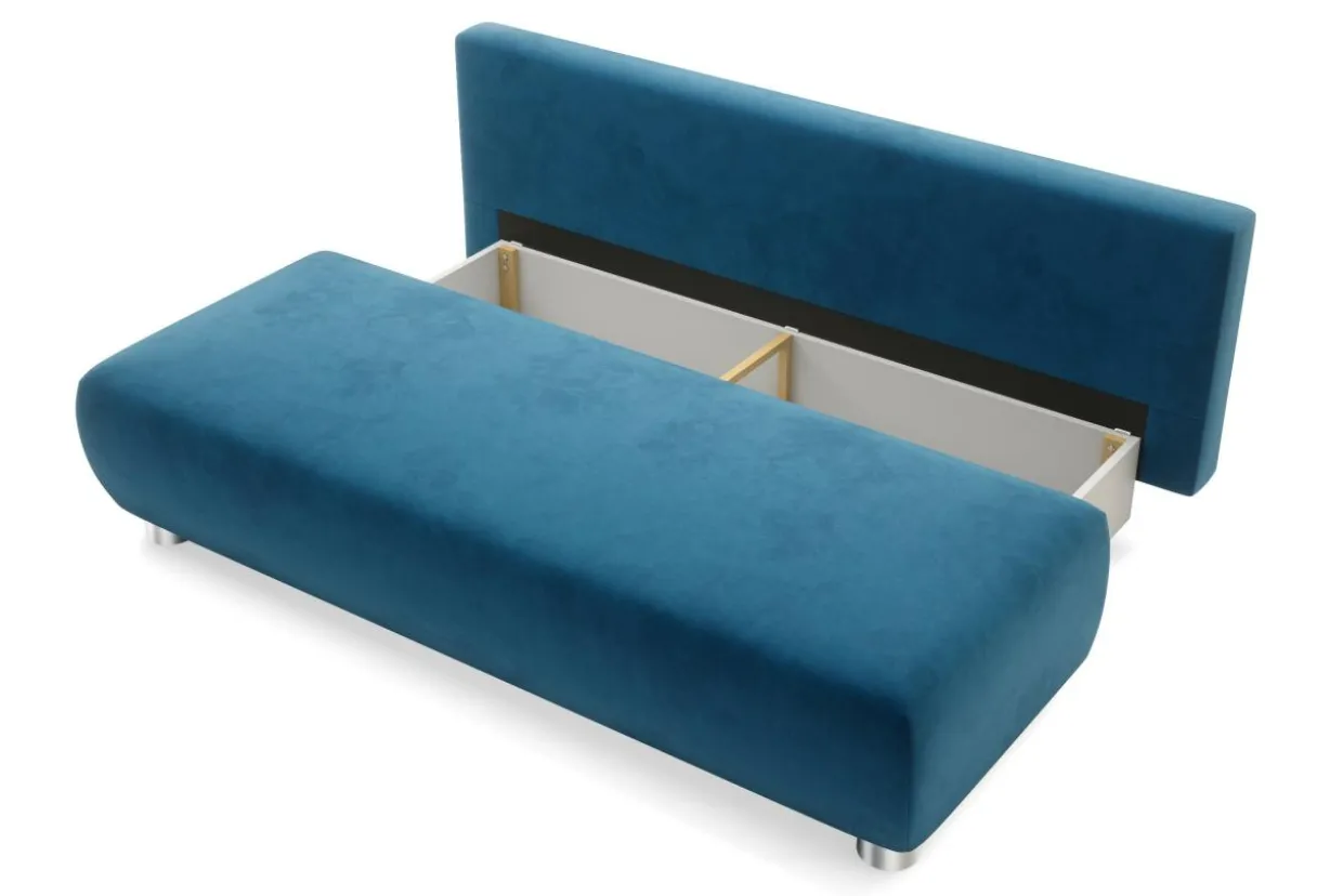 Pod siedziskiem znajduje się pojemnik na pościel, koce czy poduszki.