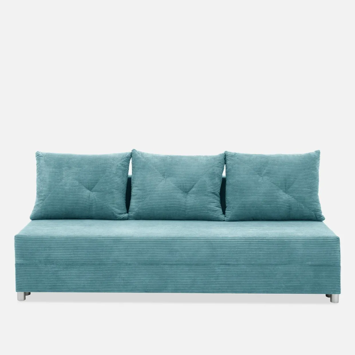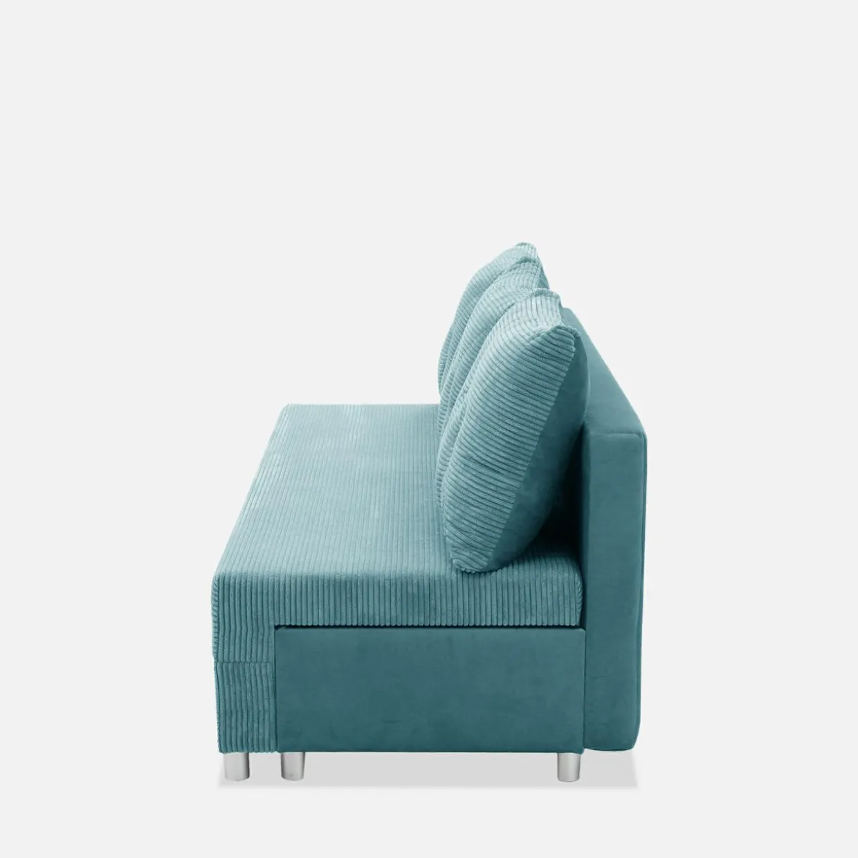 - Widoczne części sofy takie jak siedzisko czy przody poduszek zostały wykonane ze sztruksowej tkaniny POSO w kolorze jasnoturkosowym. Pozostałe części są obite gładką, pluszową tkaniną KRONOS w tym samym kolorze.