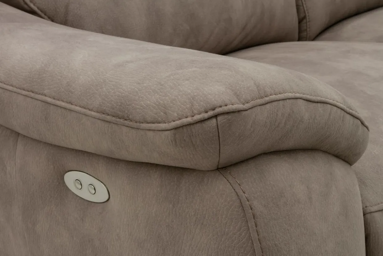 Tapicerowana tkaniną imitującą skórę w kolorze taupe – sofa wprowadzi do wnętrza poczucie elegancji.