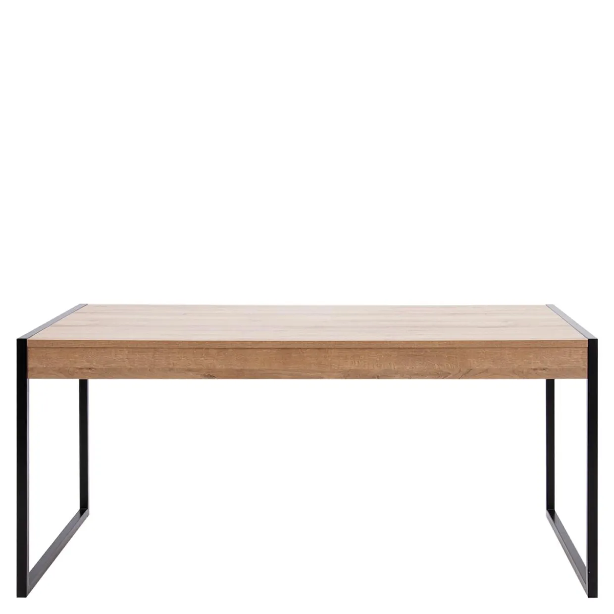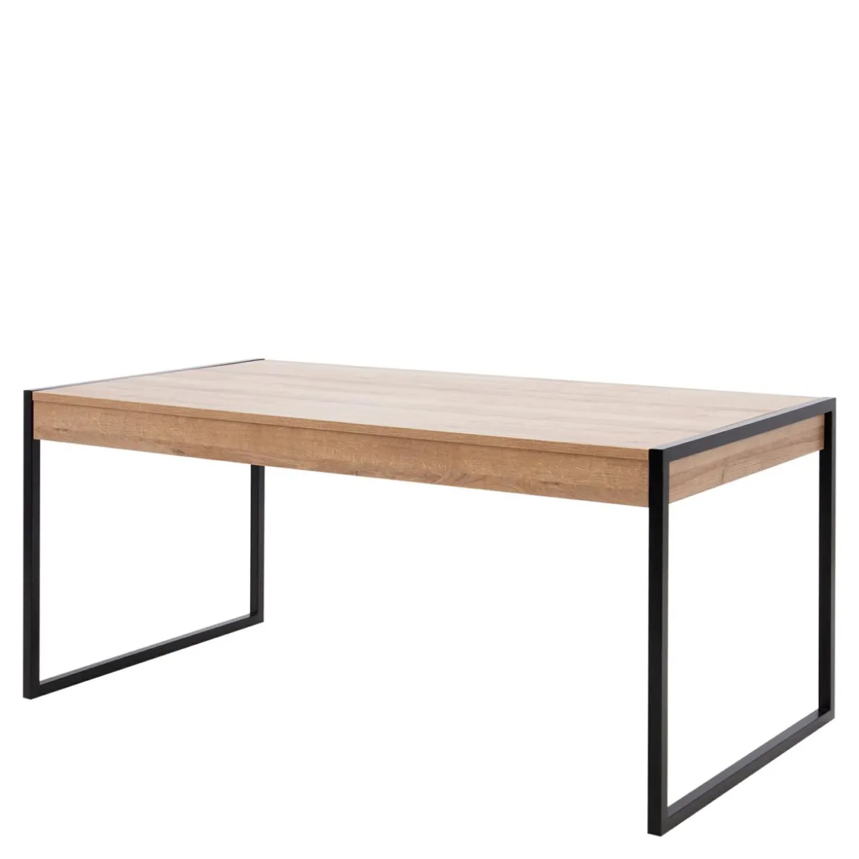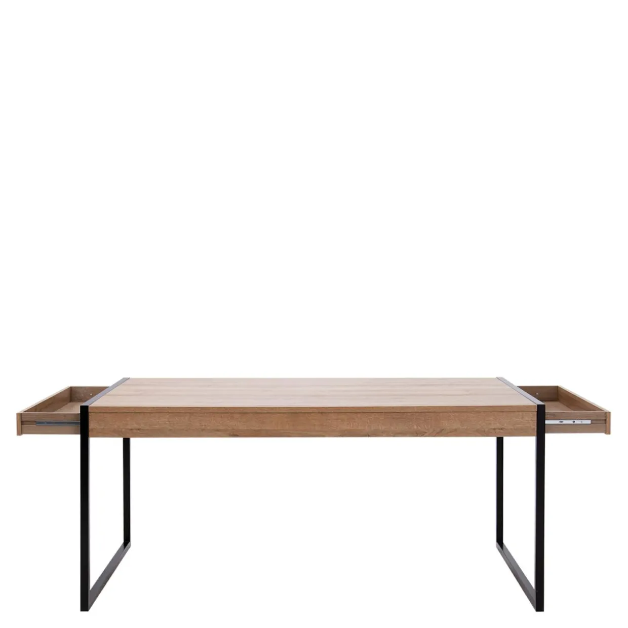 Wybierz stół z szufladami w dekorze imitującym kolor naturalnego drewna z czarnymi metalowymi nóżkami.