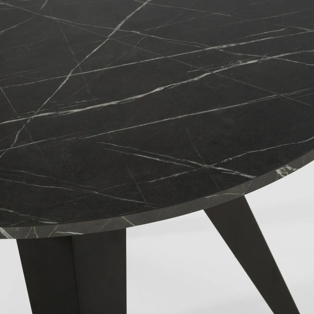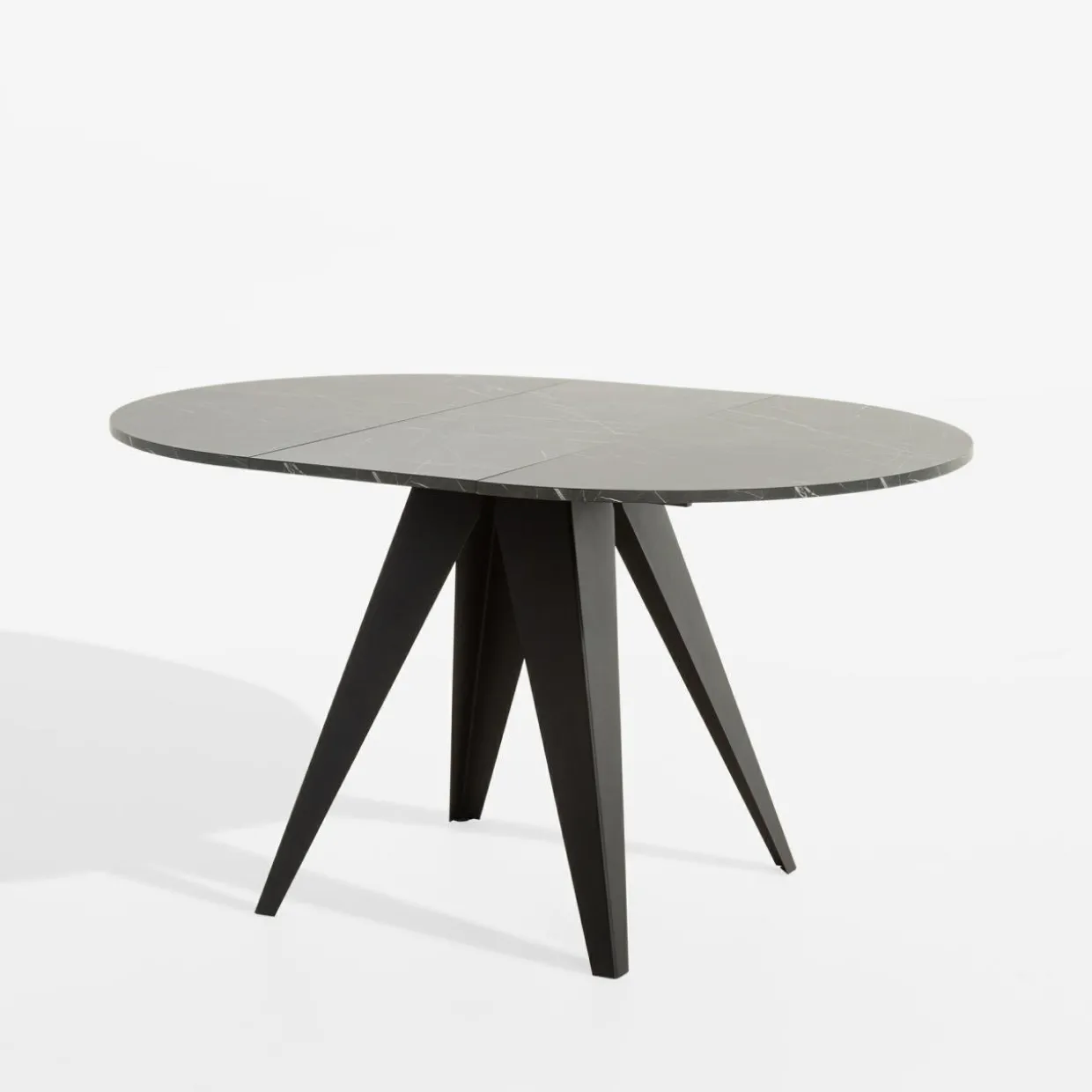 Marmurkowy wzór na blacie i obrzeżach przykuje spojrzenia i doda elegancji. Blat został połączony z matowym czarnym wykończeniem metalowych nóg – taka kompozycja wpisze się w minimalistyczne i nowoczesne wnętrza jadalni.