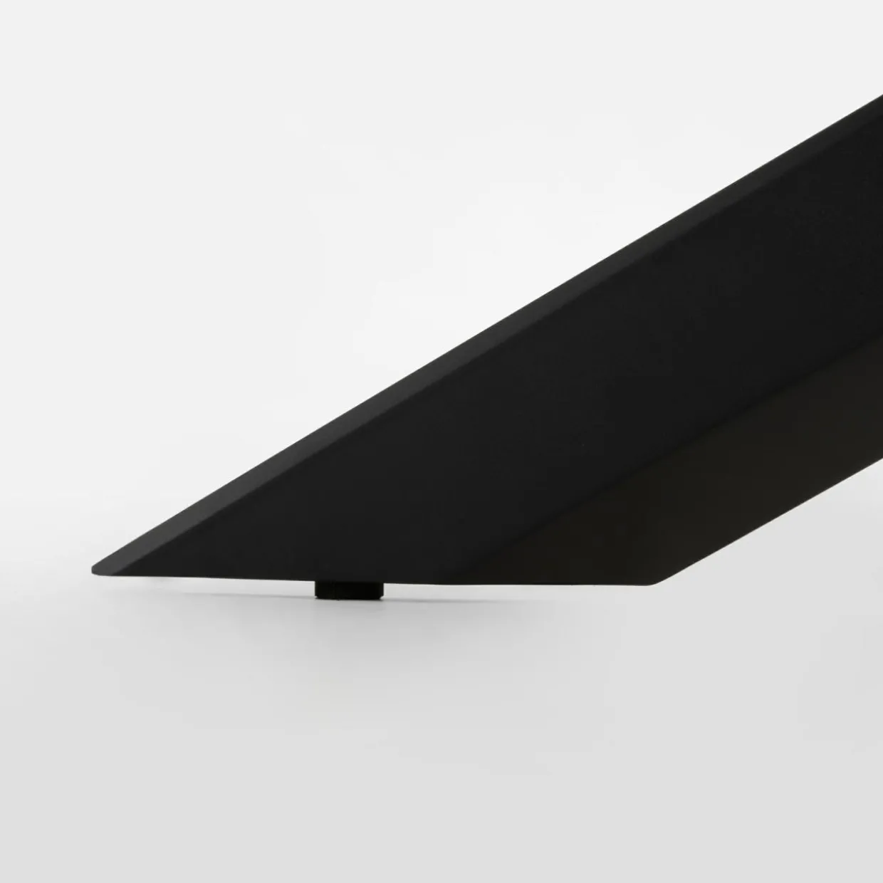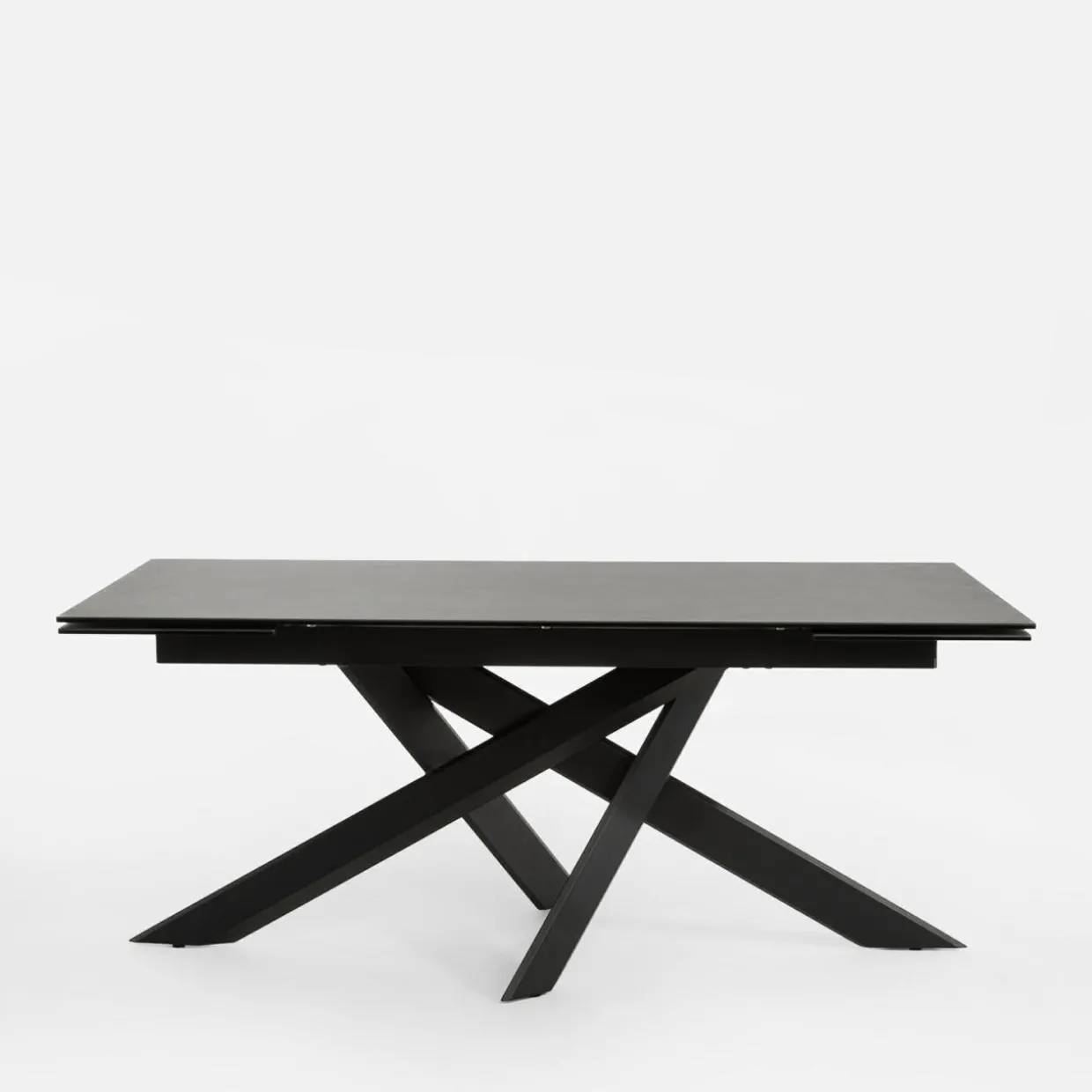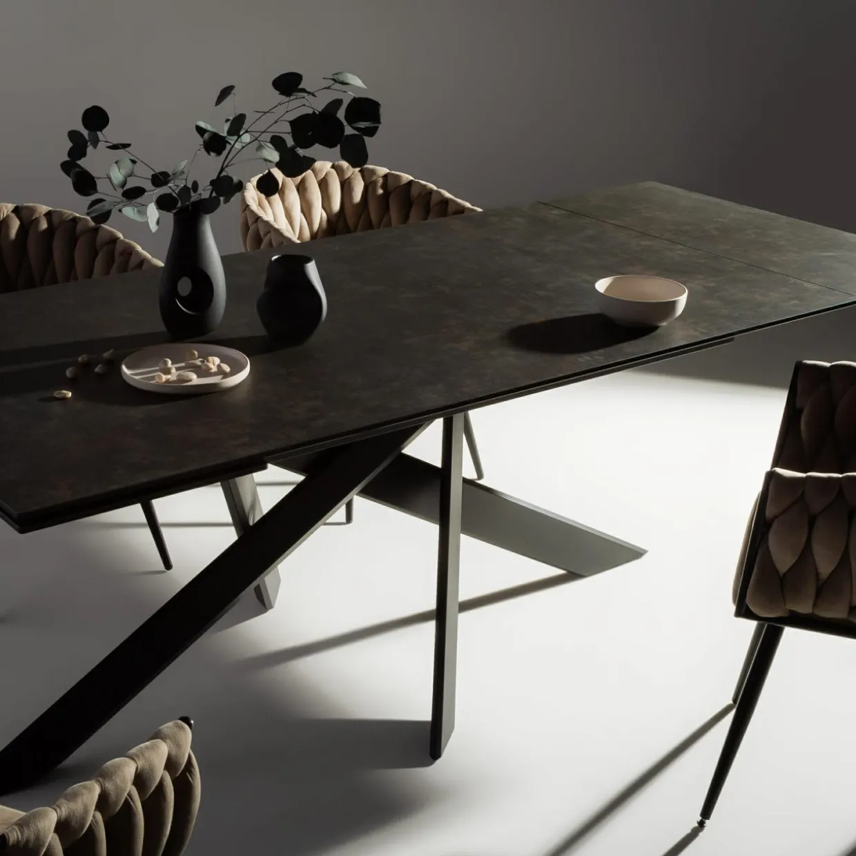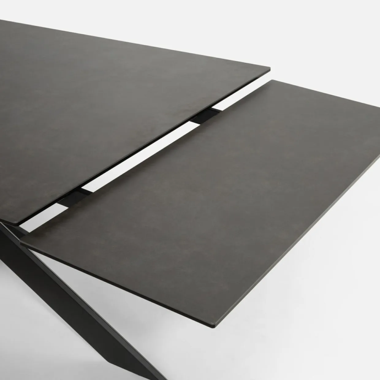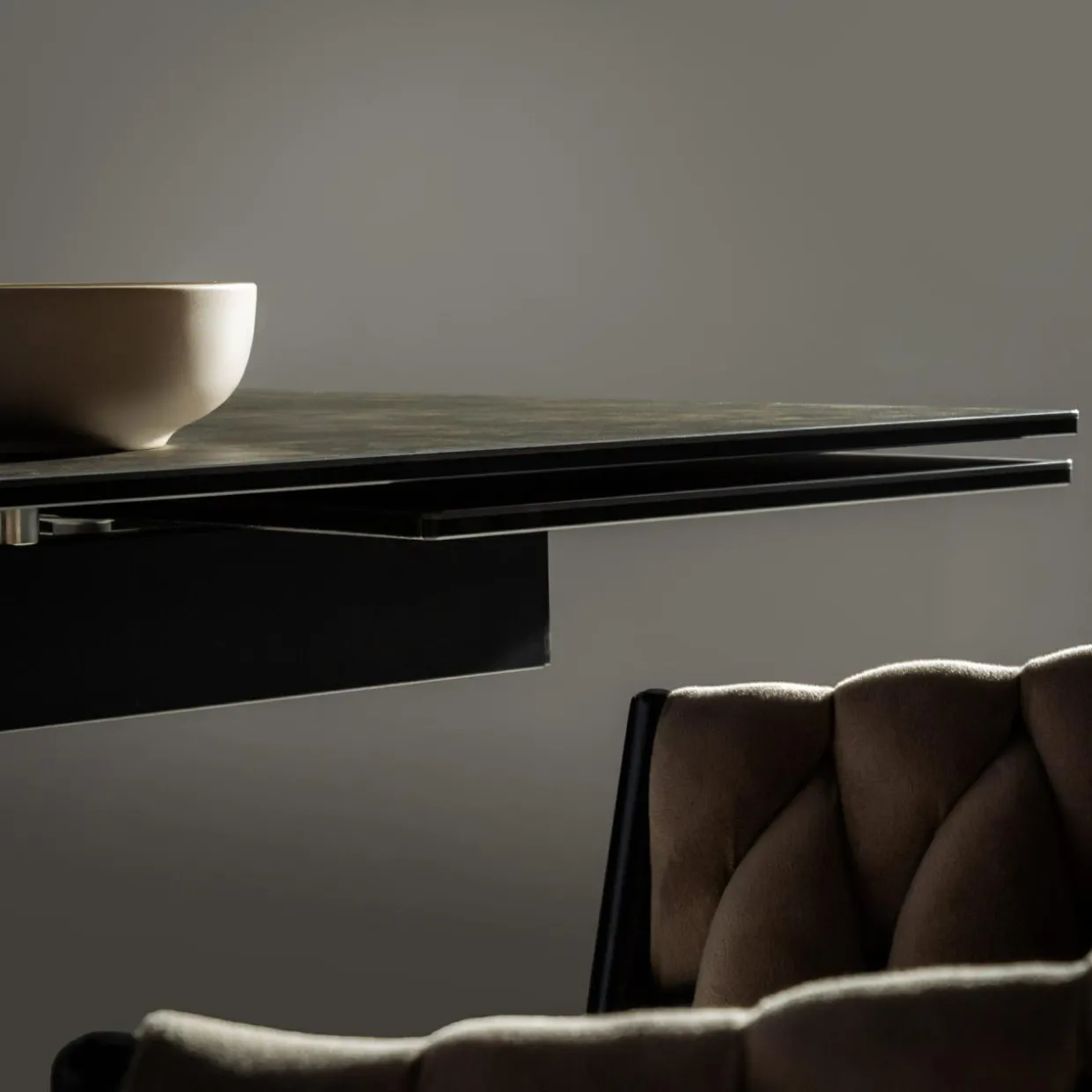 - Prostokątny blat stołu wykonany został hartowanego szkła i pokryty ciemną hiszpańską ceramiką. Koresponduje on z krzywiznami stelaża oraz podstawy