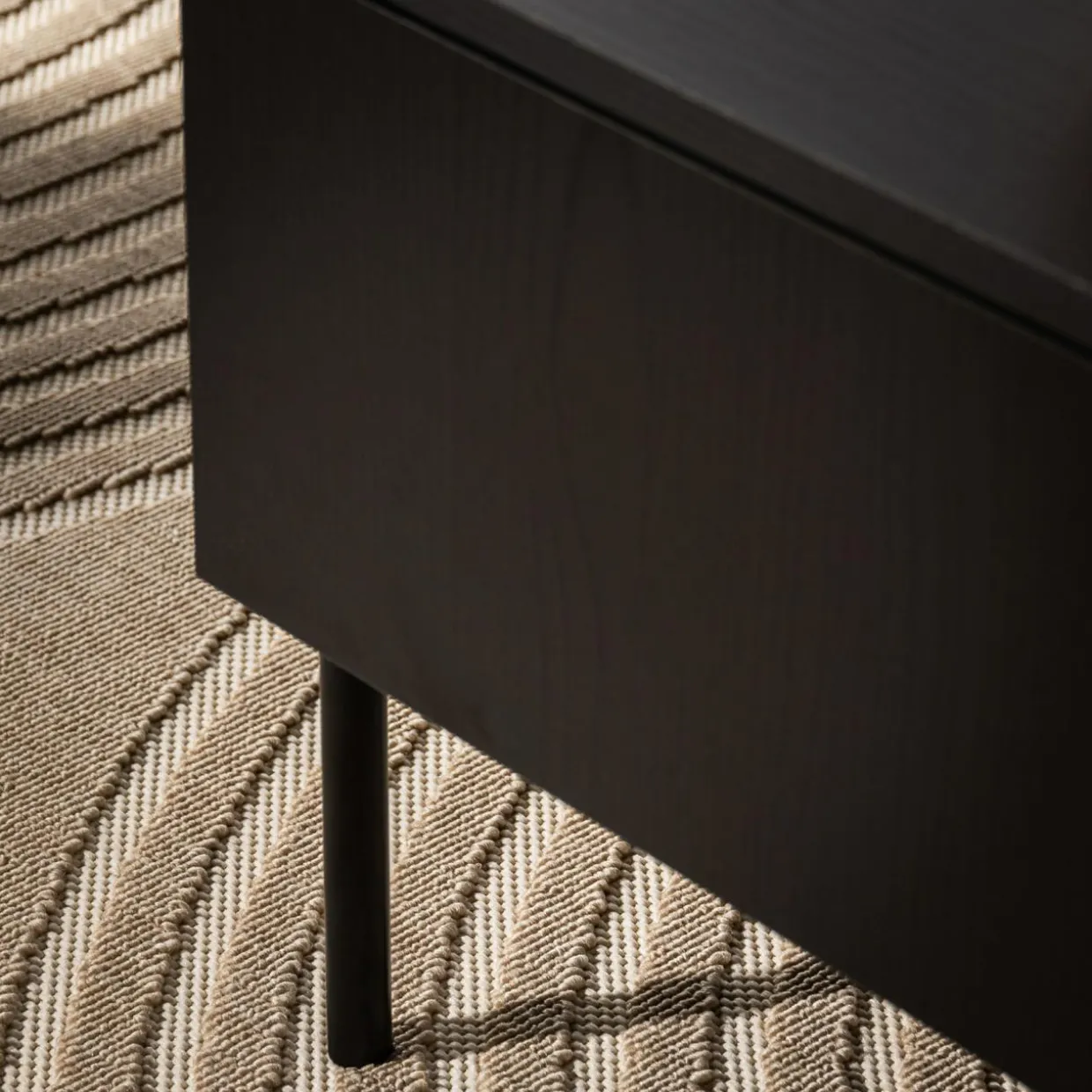 - Meble charakteryzuje czarne wykończenie. Ciemną i elegancką kolorystykę dopełnia rysunek drewna.