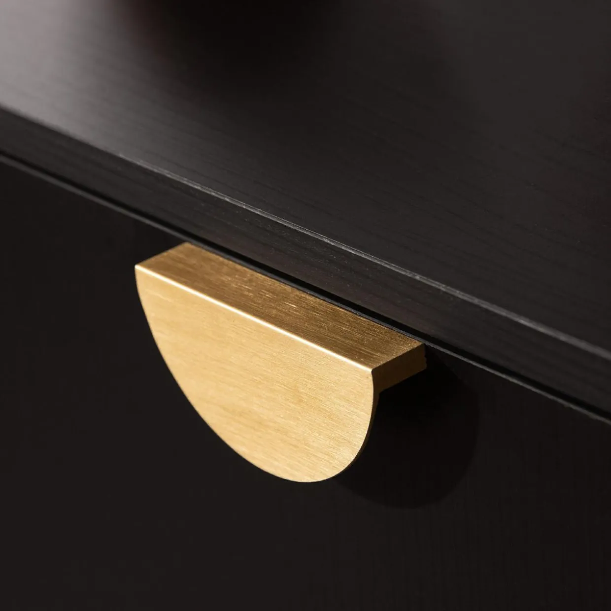 - Półokrągłe metalowe uchwyty wyraźnie odznaczają się na frontach, tworząc kontrast dla ciemnych mebli.